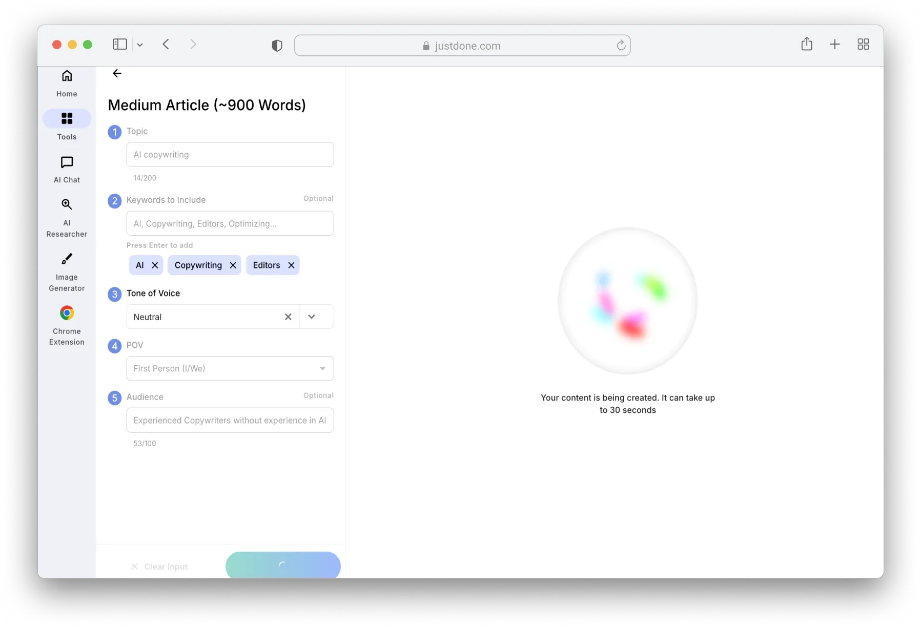 Include specific keywords to guide the content. JustDone naturally weaves them into headlines, subheadings, and body text—without keyword stuffing or awkward phrasing.