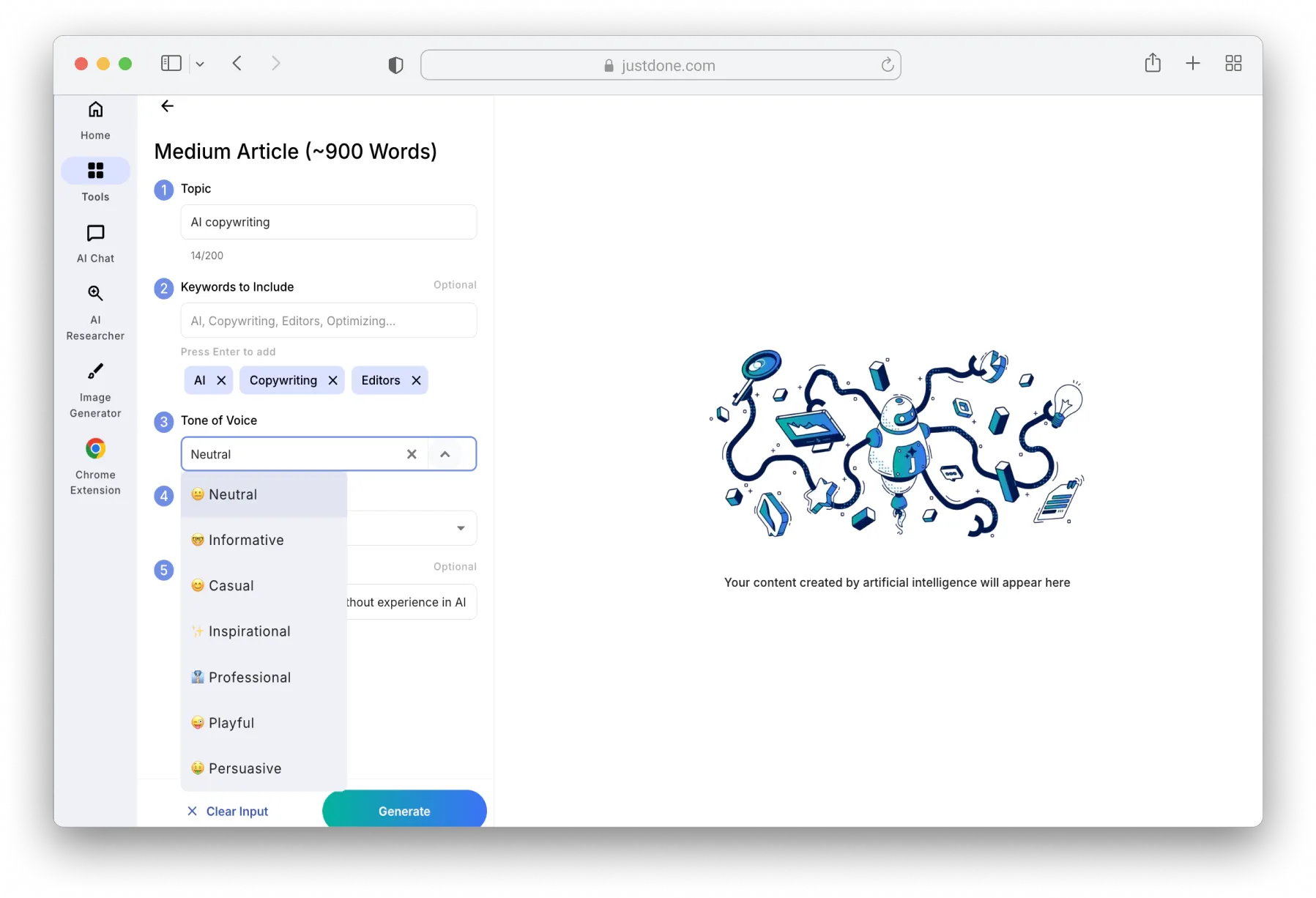 Click "Generate" and get a complete Medium-style article in under 30 seconds. JustDone writes structured content with clear sections, engaging introductions, and natural conclusions—no templates, no generic fluff.