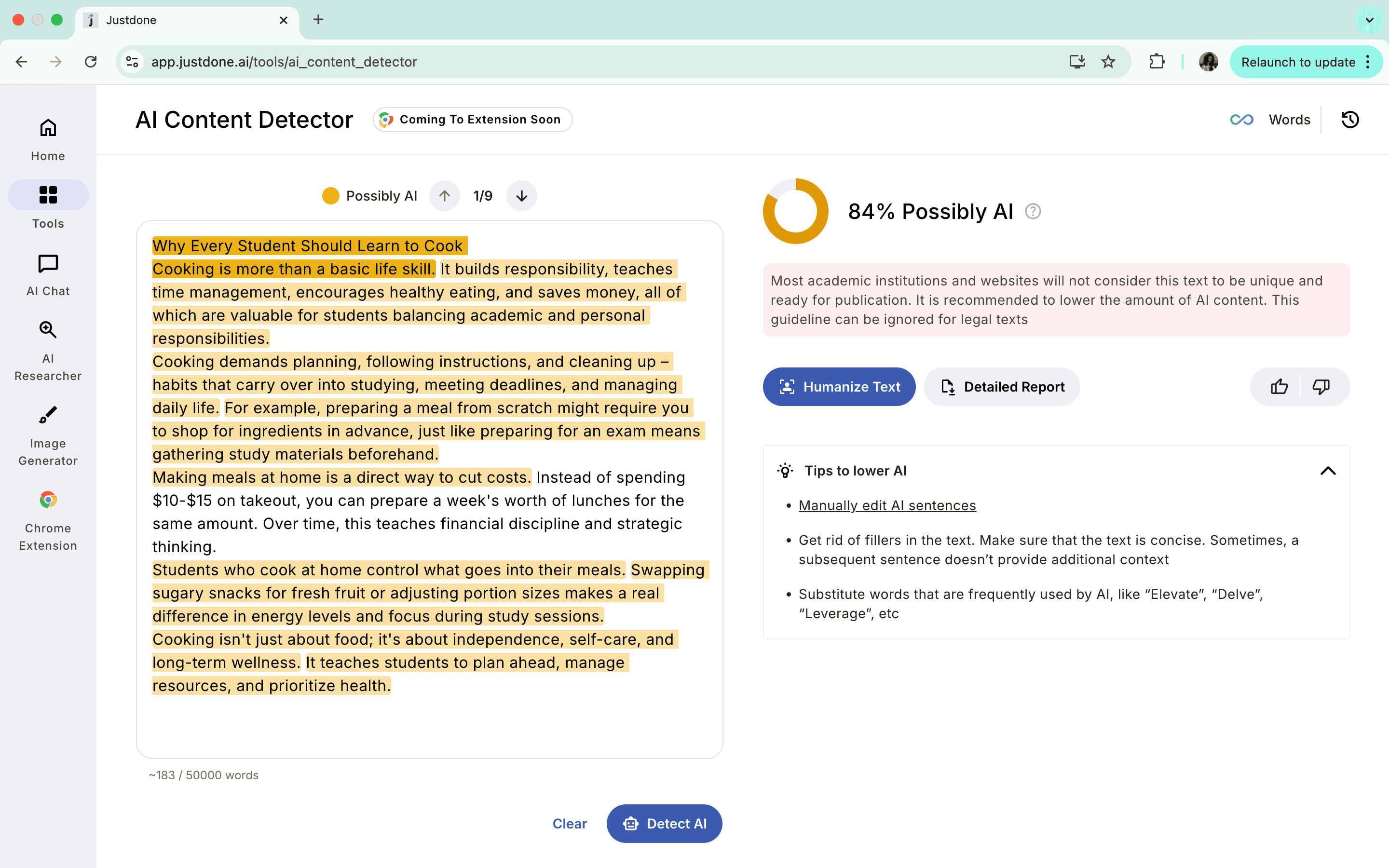 - Run an AI detector that shows spans. For example, I usually check my texts with JustDone AI detector, because it shows less false positives than others. But do not decide on a percentage alone. Use the highlights to focus your review and decide with context.