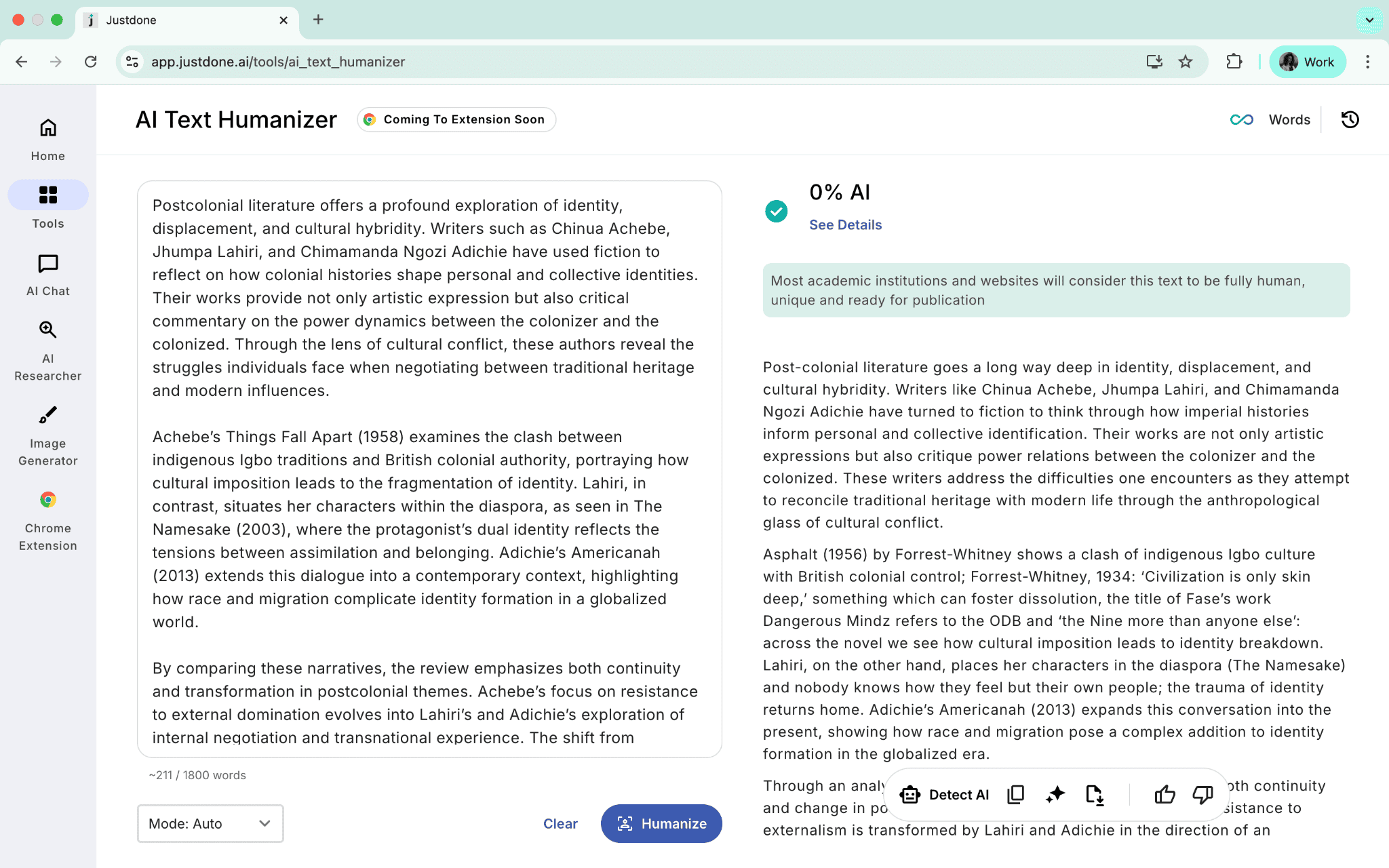 Sometimes, I pair tools to make content sound more human. I start with span-level signals from JustDone’s AI detector. If the voice is stiff, I apply an AI humanization that preserves structure and key vocabulary. That transparency keeps the process fair and speeds writing. Let’s look at how we can humanize AI text from a student’s literature review. It was flagged as 99% AI-written, but after AI humanizer, it is 0% AI.