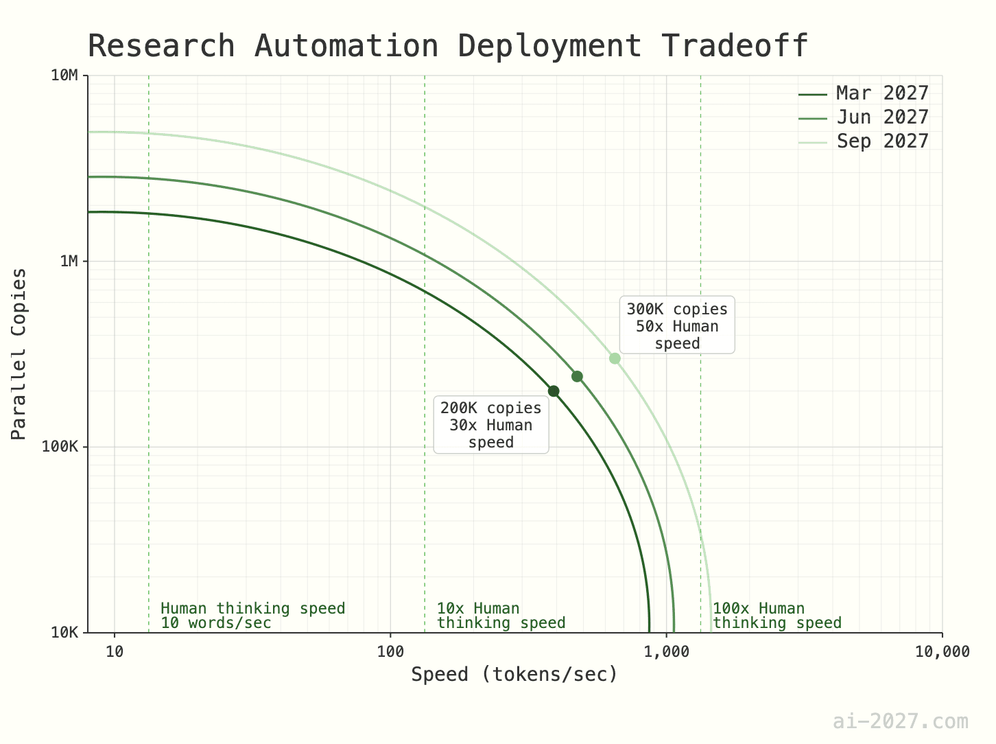 - Training budgets will rise roughly 1,000x that of GPT-4. That lab could run 200,000 AI “copies” at 30x speed using just 6% of its inference pool.