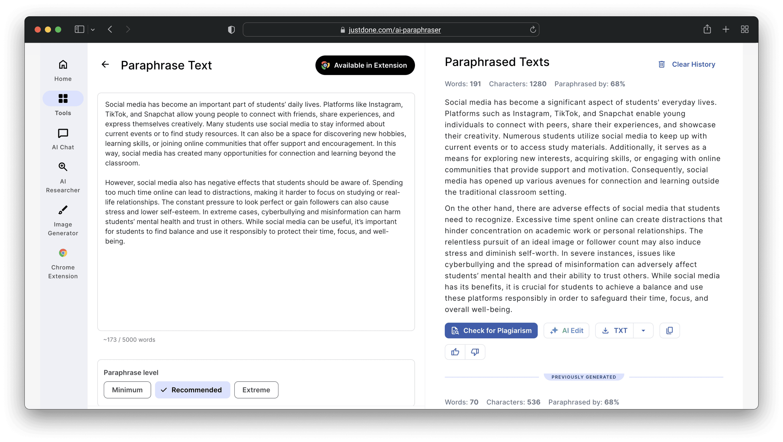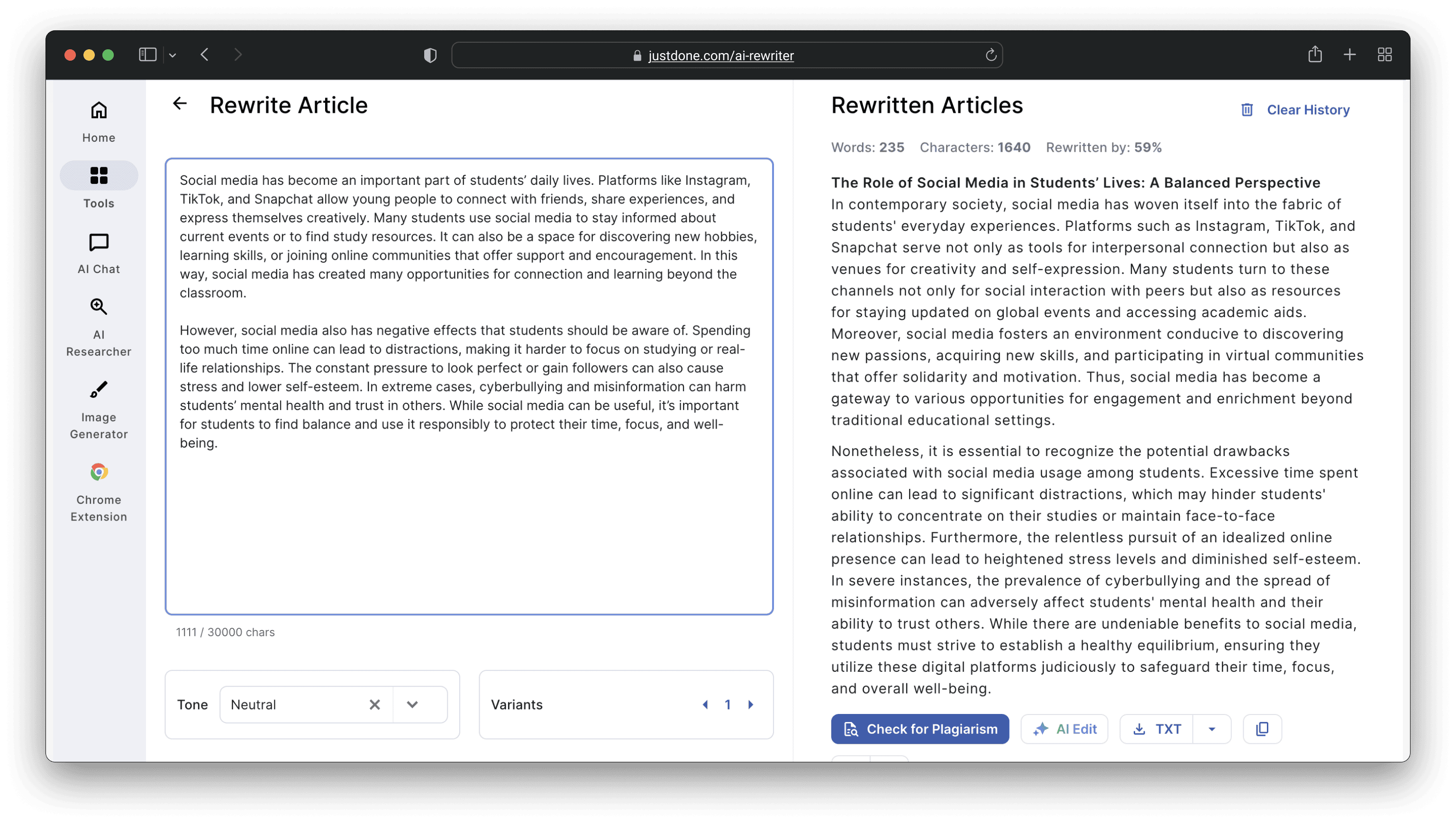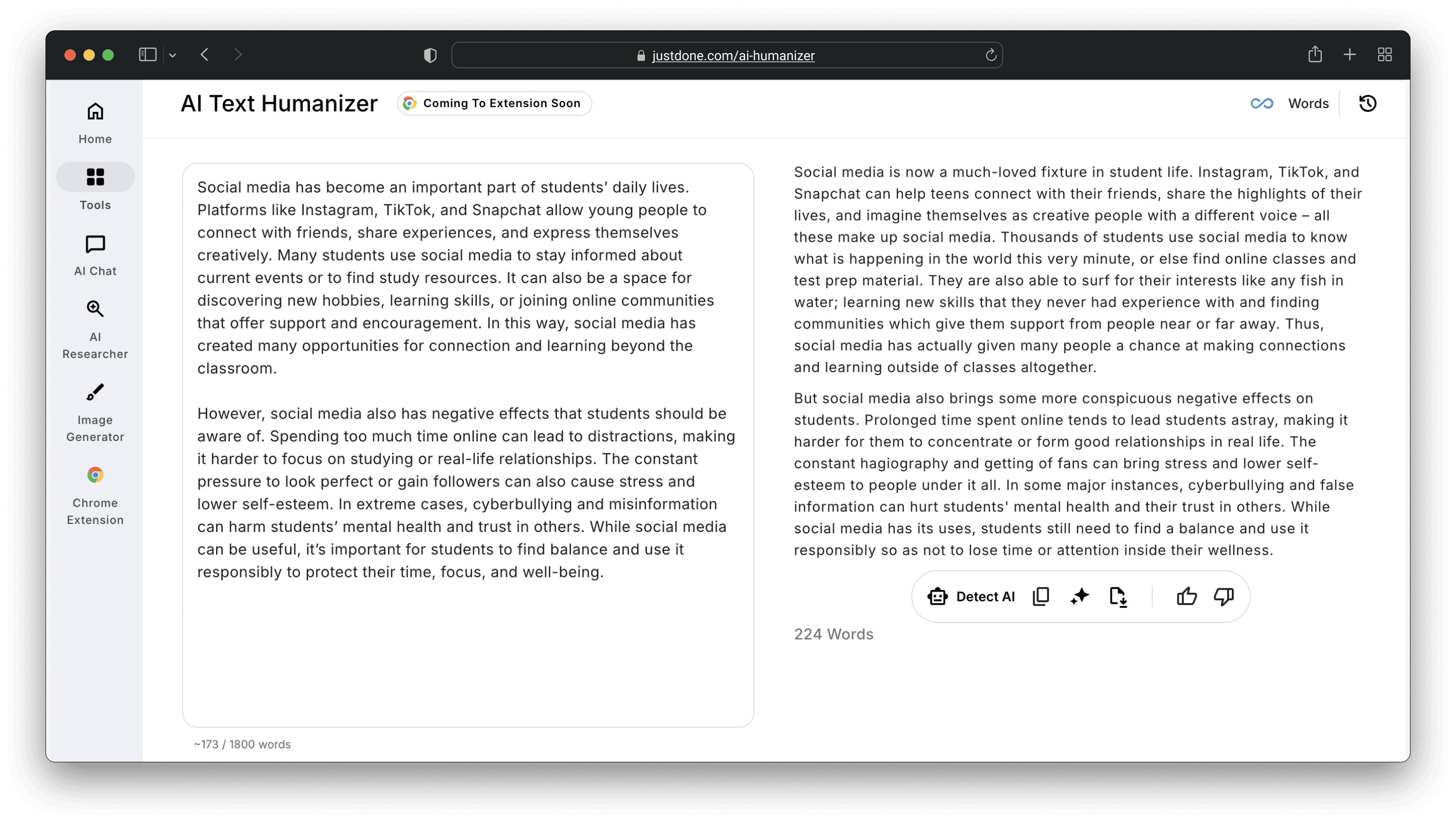 JustDone was built to help you manage this entire flow. You can run the same passage through multiple tools right on the platform to see how each improves it, and pick the one that best fits your tone.