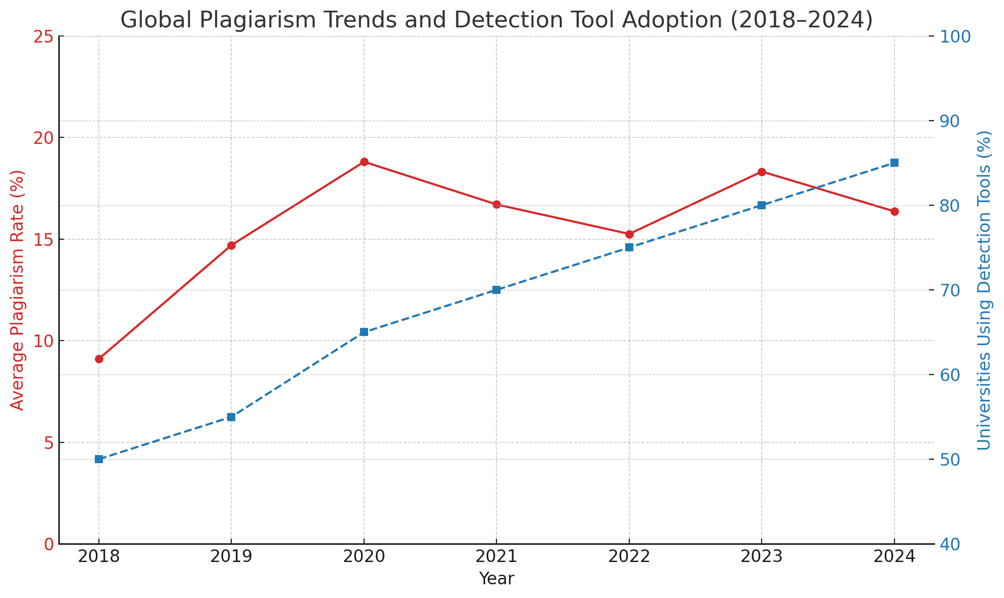 If we look over the period between 2018 to 2024, the average plagiarism rate in academic works has changed significantly. Growth spikes correspond with the great shift to online learning and generative AI tools, while declines are due to improvements in detection and academic integrity policies.