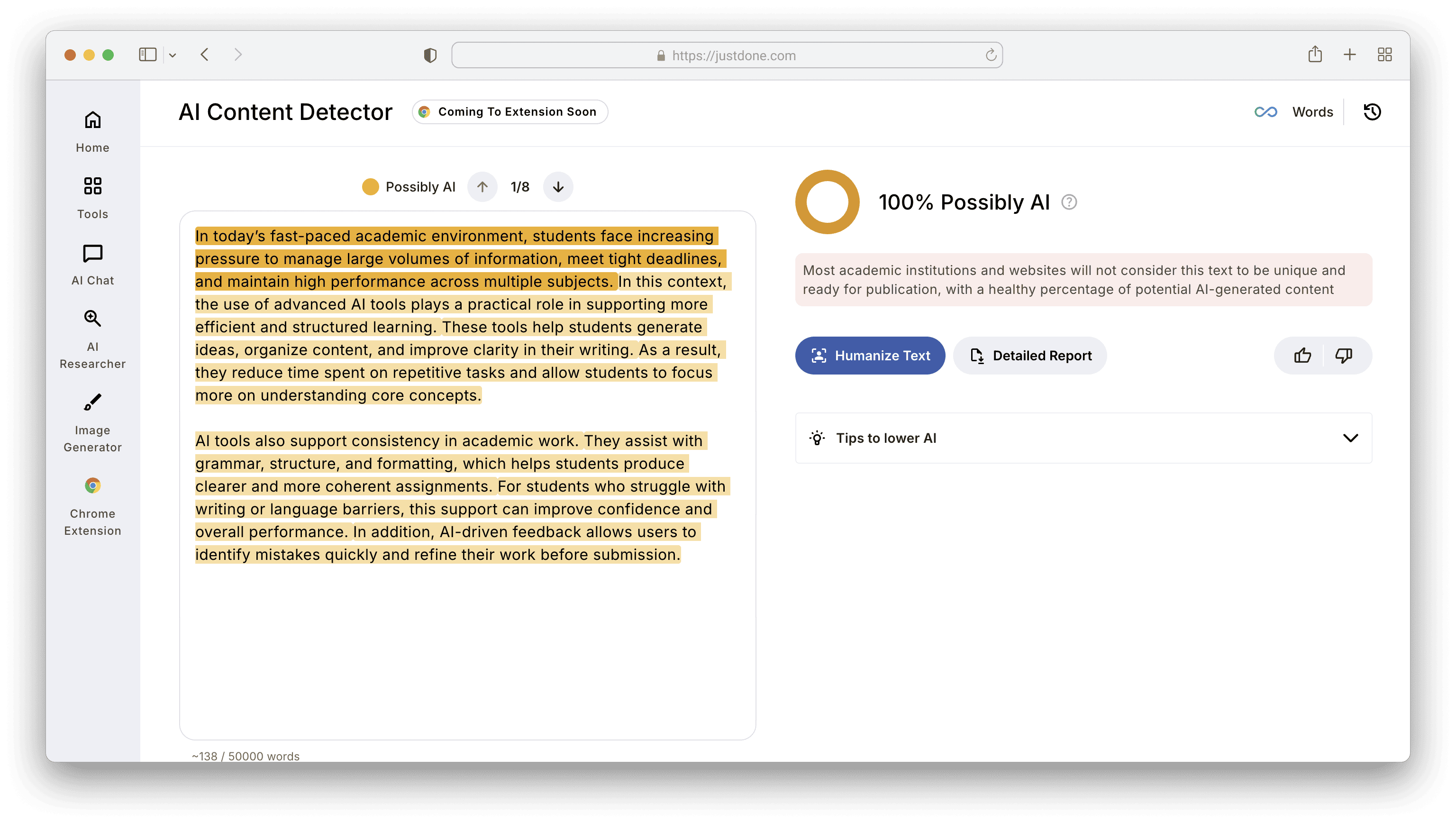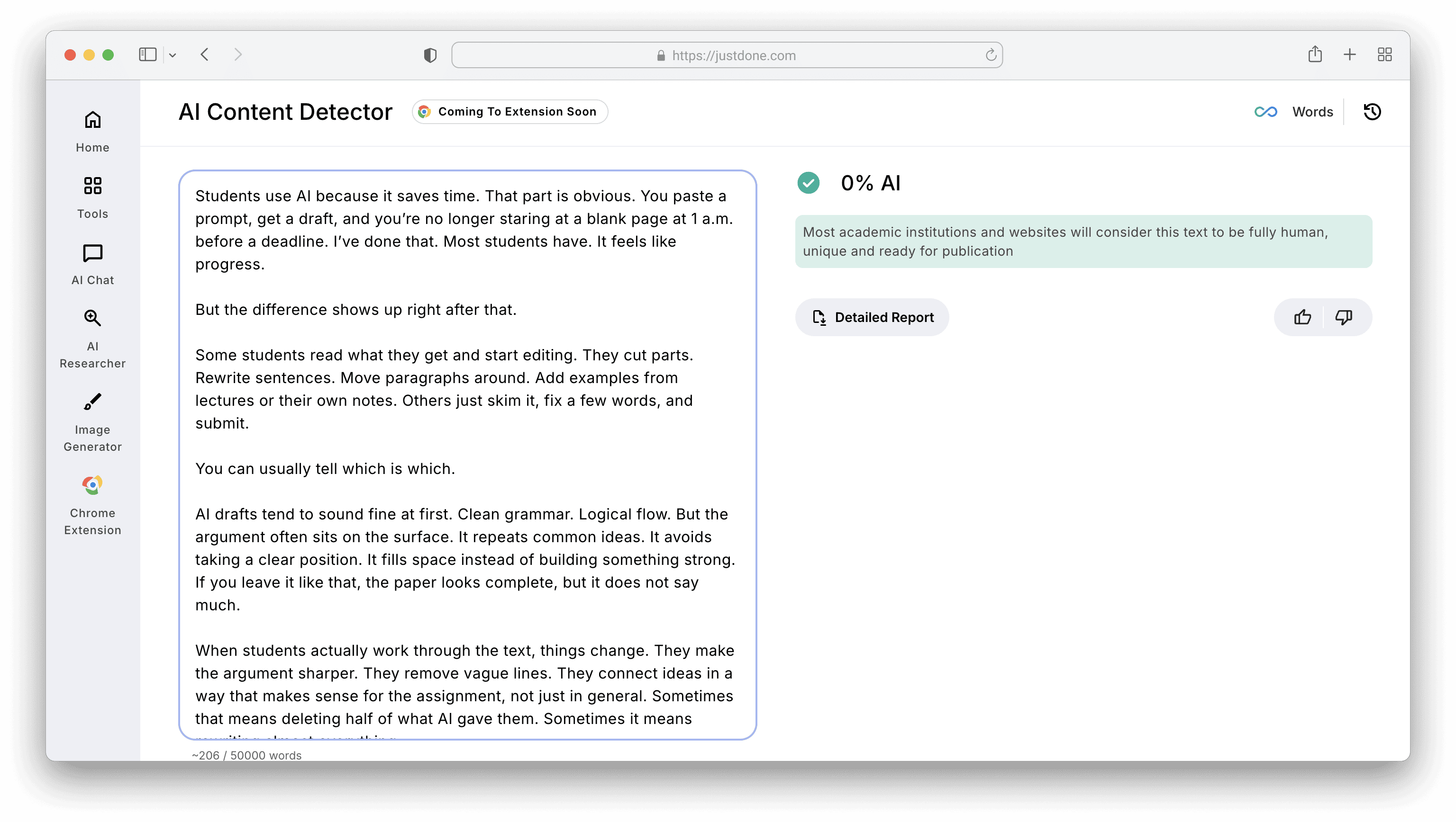 Run your text through JustDone's AI Detector before submitting. Sections highlighted with high-confidence AI scores are where your AI word density is highest. Focus edits there, then re-check. For texts over 1,000 words, check section by section rather than as a single block — patterns accumulate across paragraphs in ways that shorter text checks can miss.