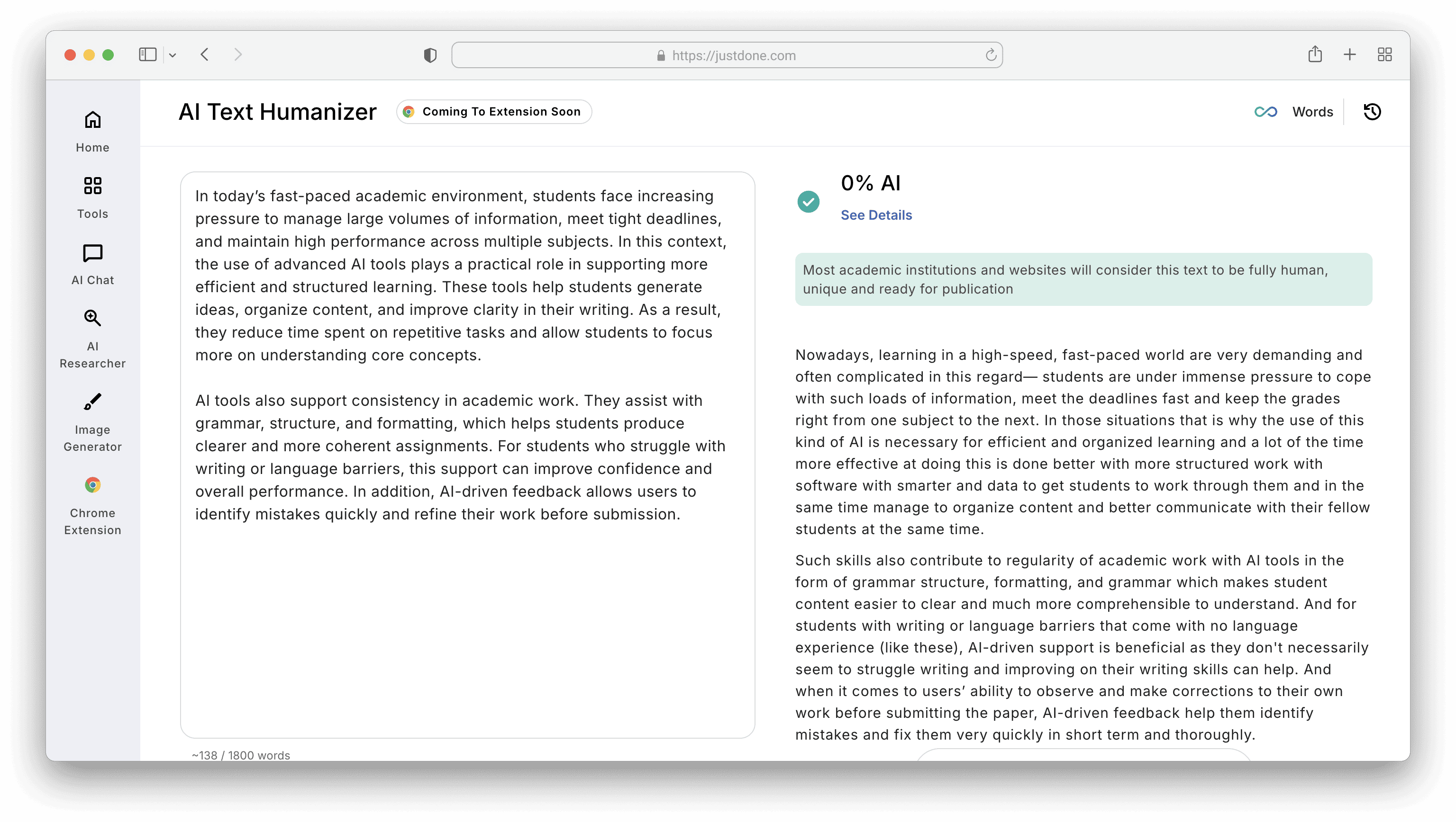 - JustDone's AI Humanizer and Paraphraser both target these patterns directly: the humanizer rewrites at the sentence level, the paraphraser breaks up predictable structure without changing your meaning.