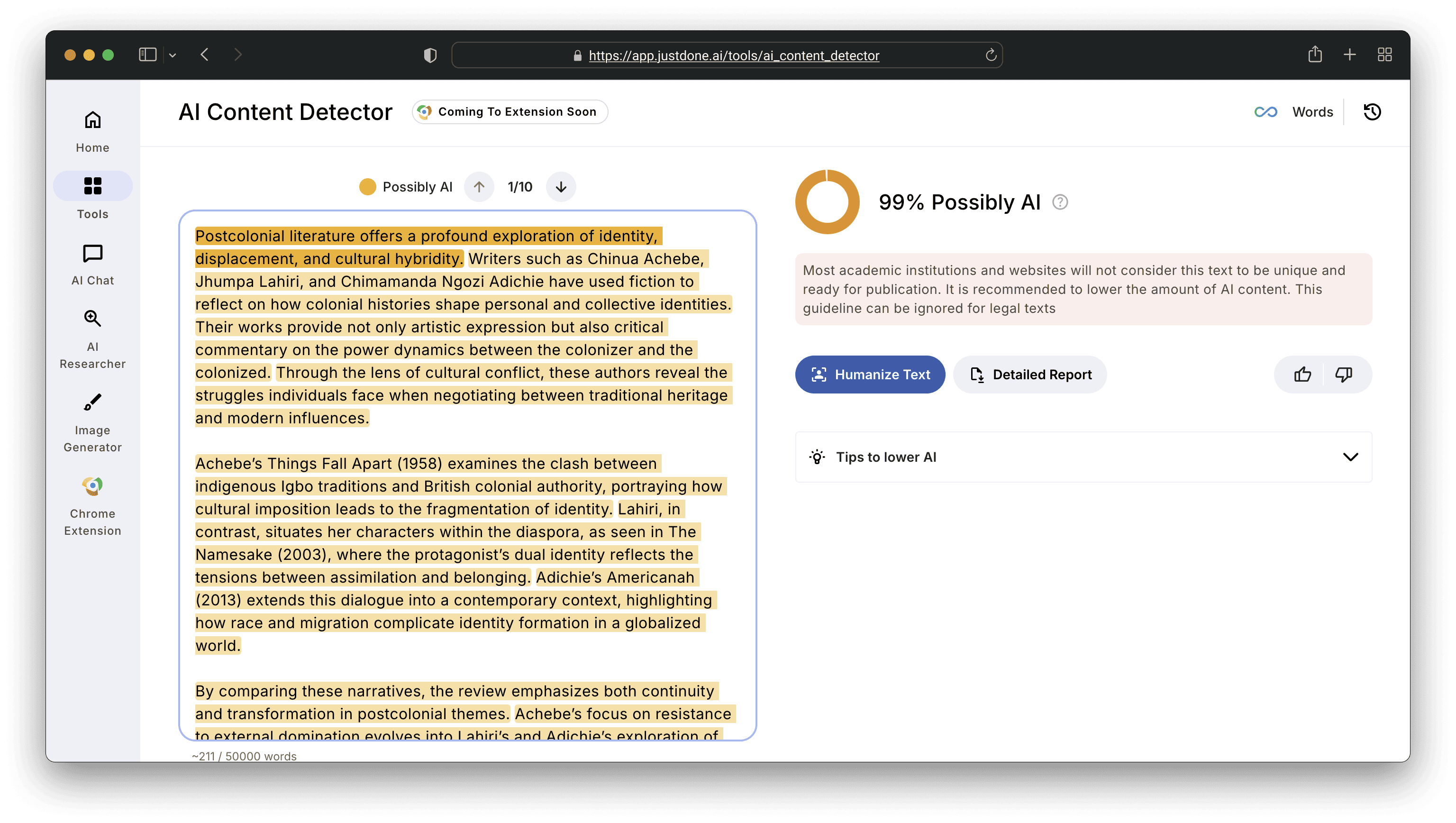 Smart detectors like JustDone don’t just say “yes” or “no”; they highlight the parts that look AI-generated. That helps you see what to change in the text.