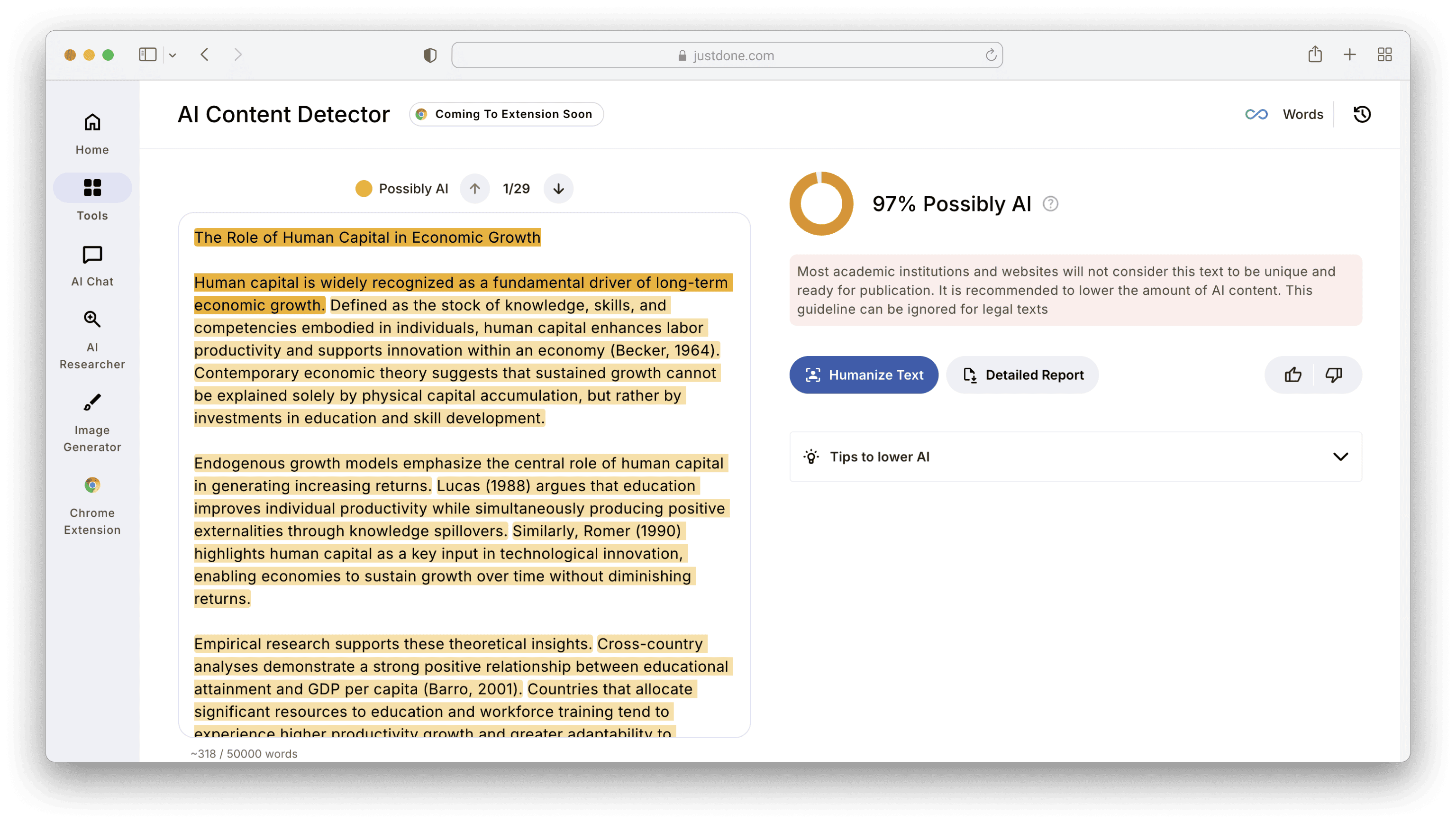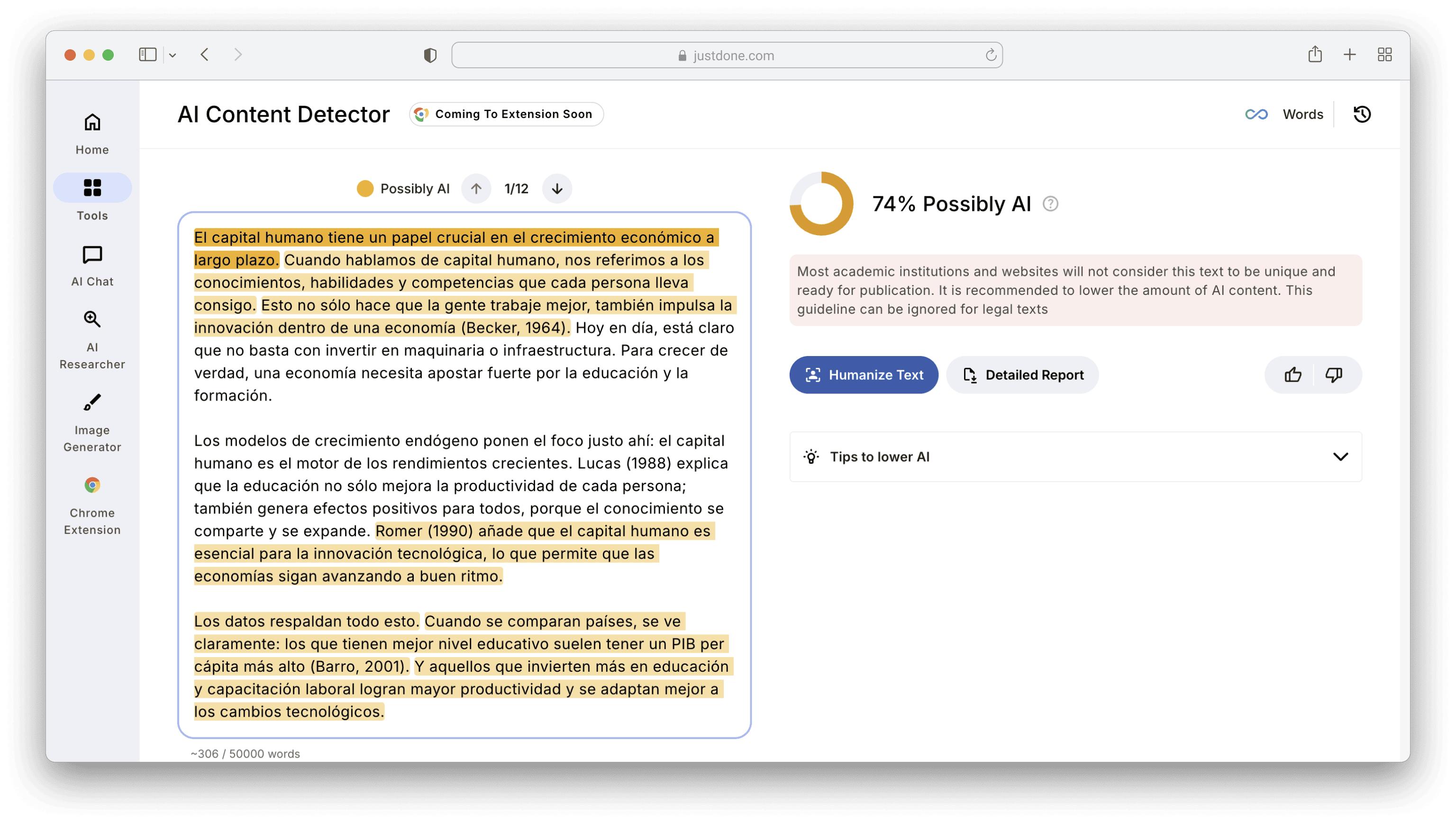 In its turn, JustDone has a built-in flow that allows to detect, humanize, check, and rehumanize content if needed.