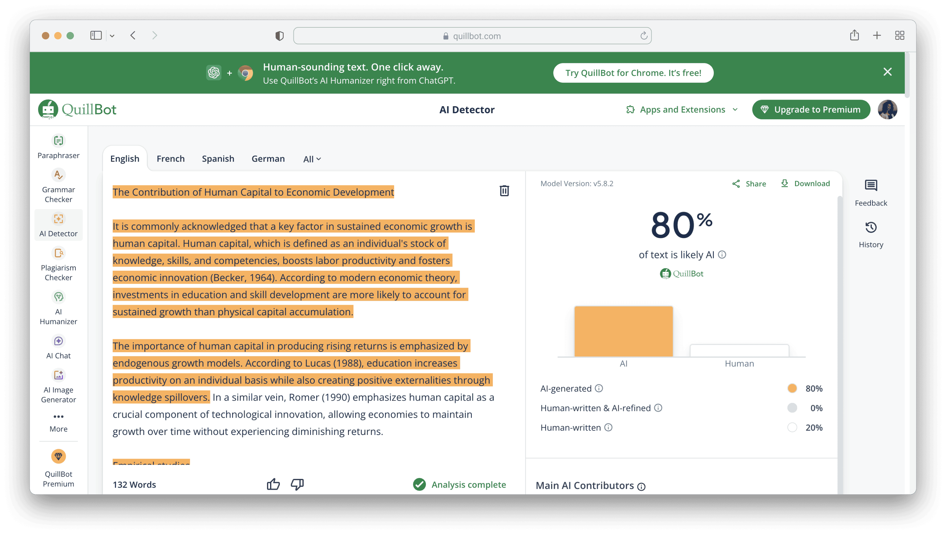QuillBot is another popular tool I tried to detect and humanize this essay. It offers paraphrasing and some language options, but in my experience, it works best in English. When used in French or Spanish, it often makes the writing sound overly formal or stiff. It’s fine for short sentences, but longer essays tend to lose their flow.