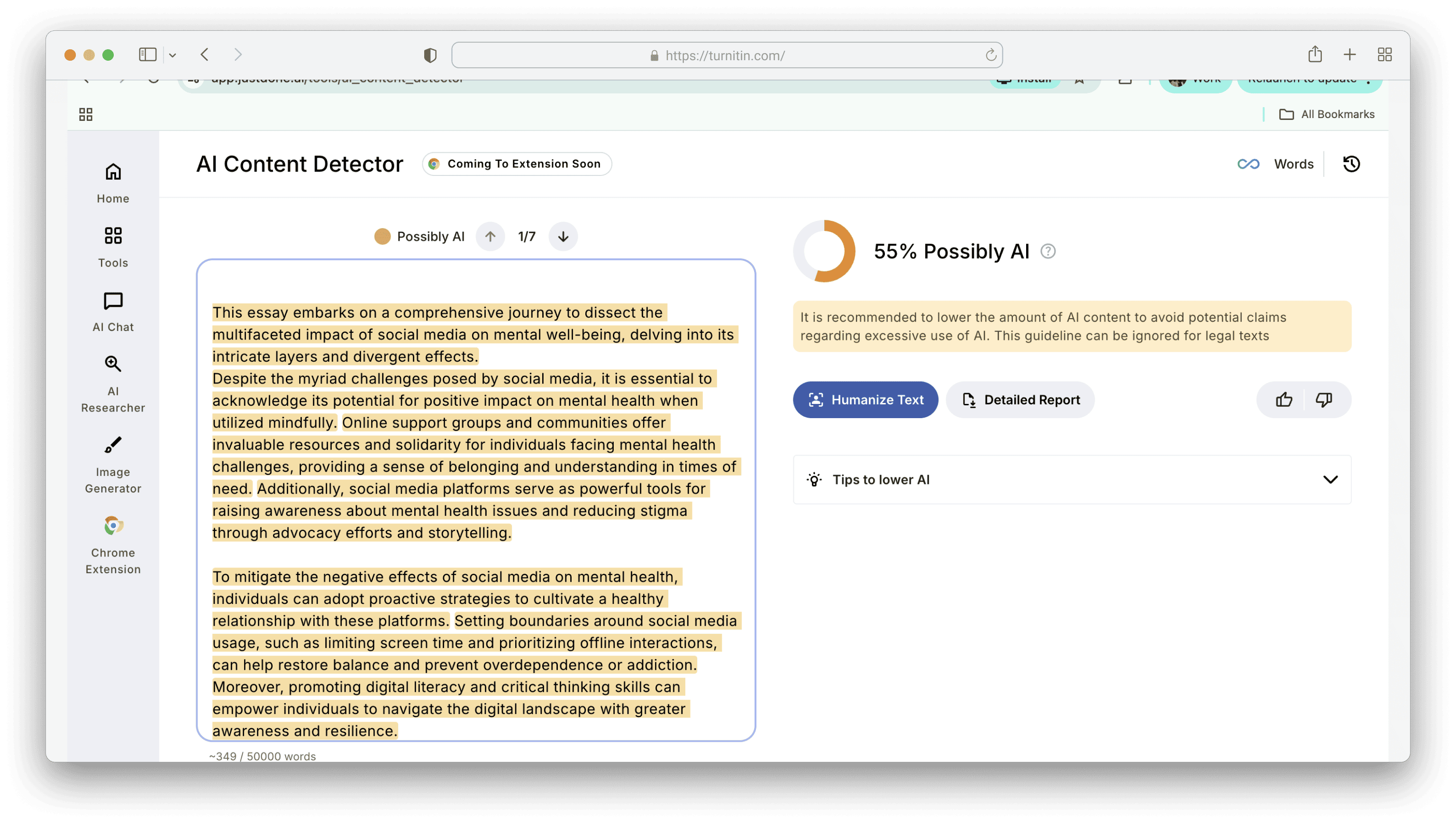 To see how closely JustDone's AI detector mirrors Turnitin, we ran the same text through both tools. Turnitin flagged it at 56% AI-generated.