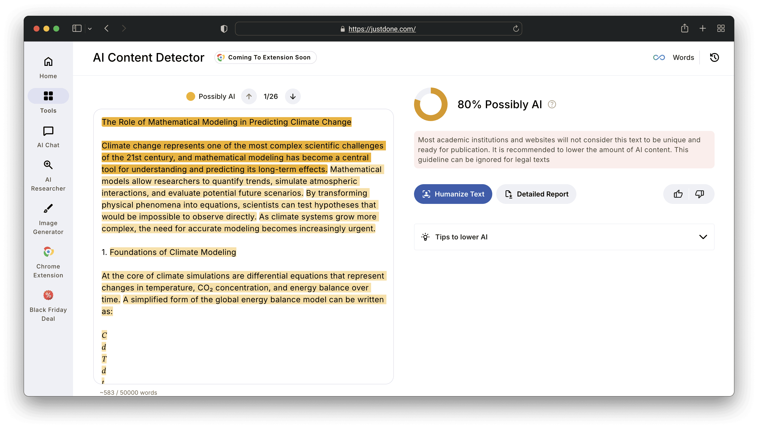 I ran the same AI-generated essay in JustDone as I did for ZeroGPT and GPTZero detectors. It demonstrates even more accurate result, an 80% score.