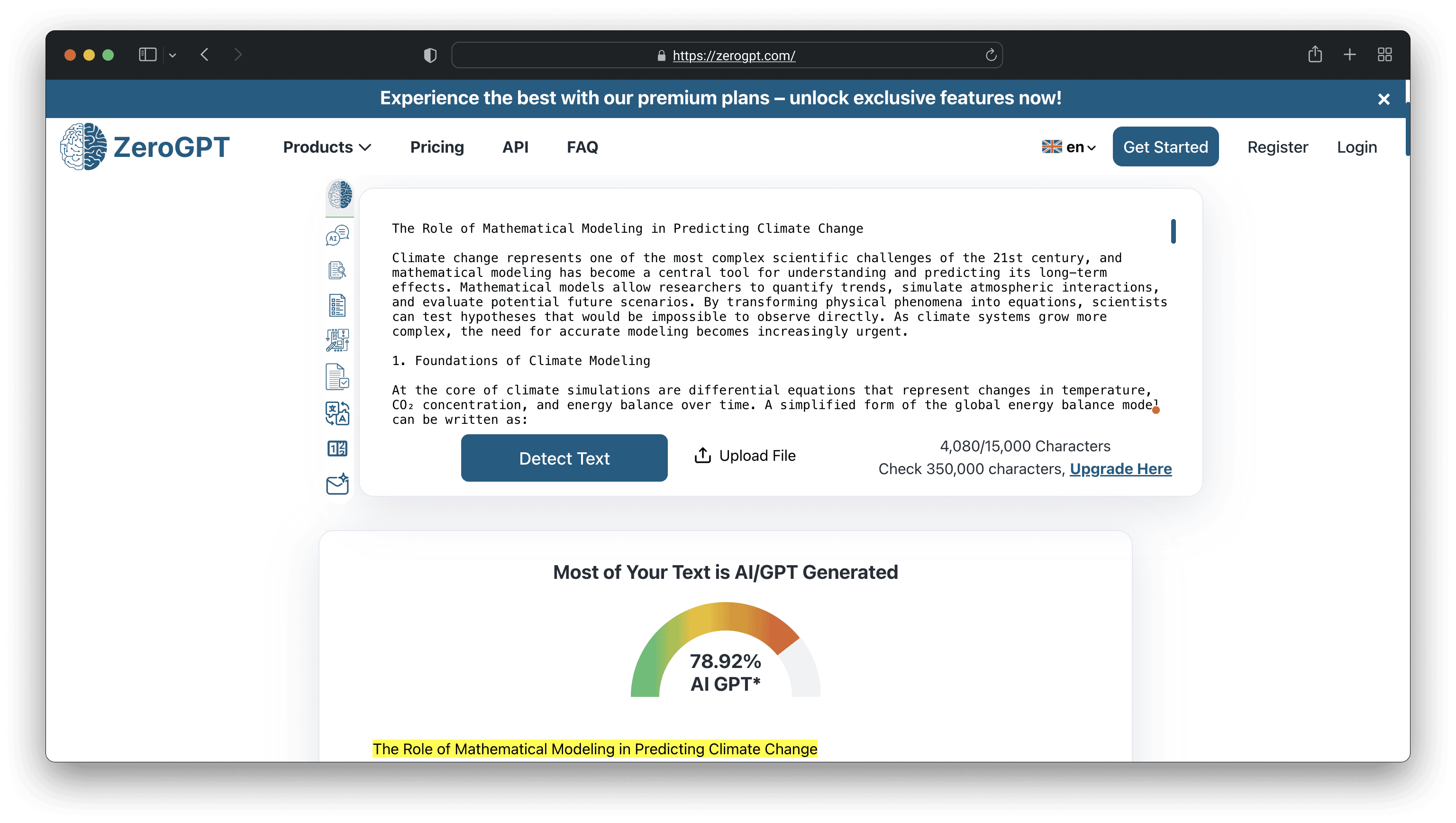 I tested both tools several times, but let's see how they perform with academic student essay about climate change with formulas, citations, and references. ZeroGPT scanned the AI-generated essay and showed 78,92% flagged score.