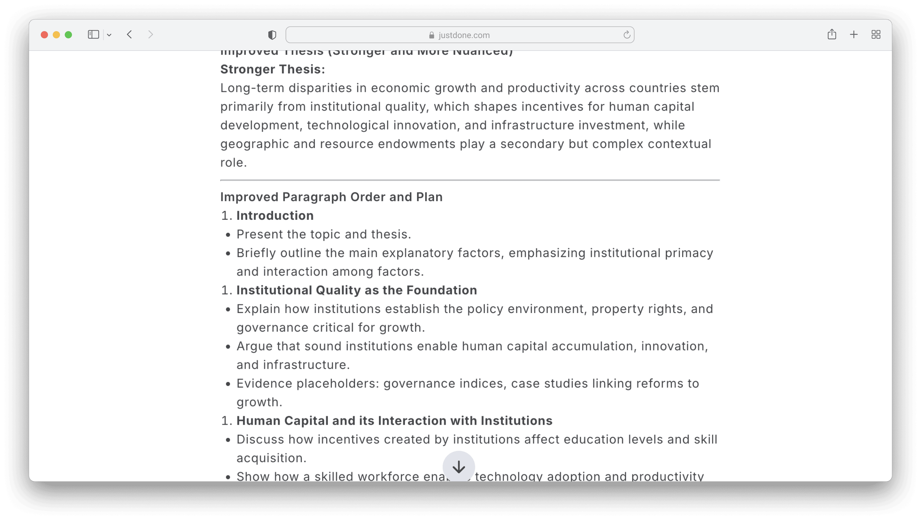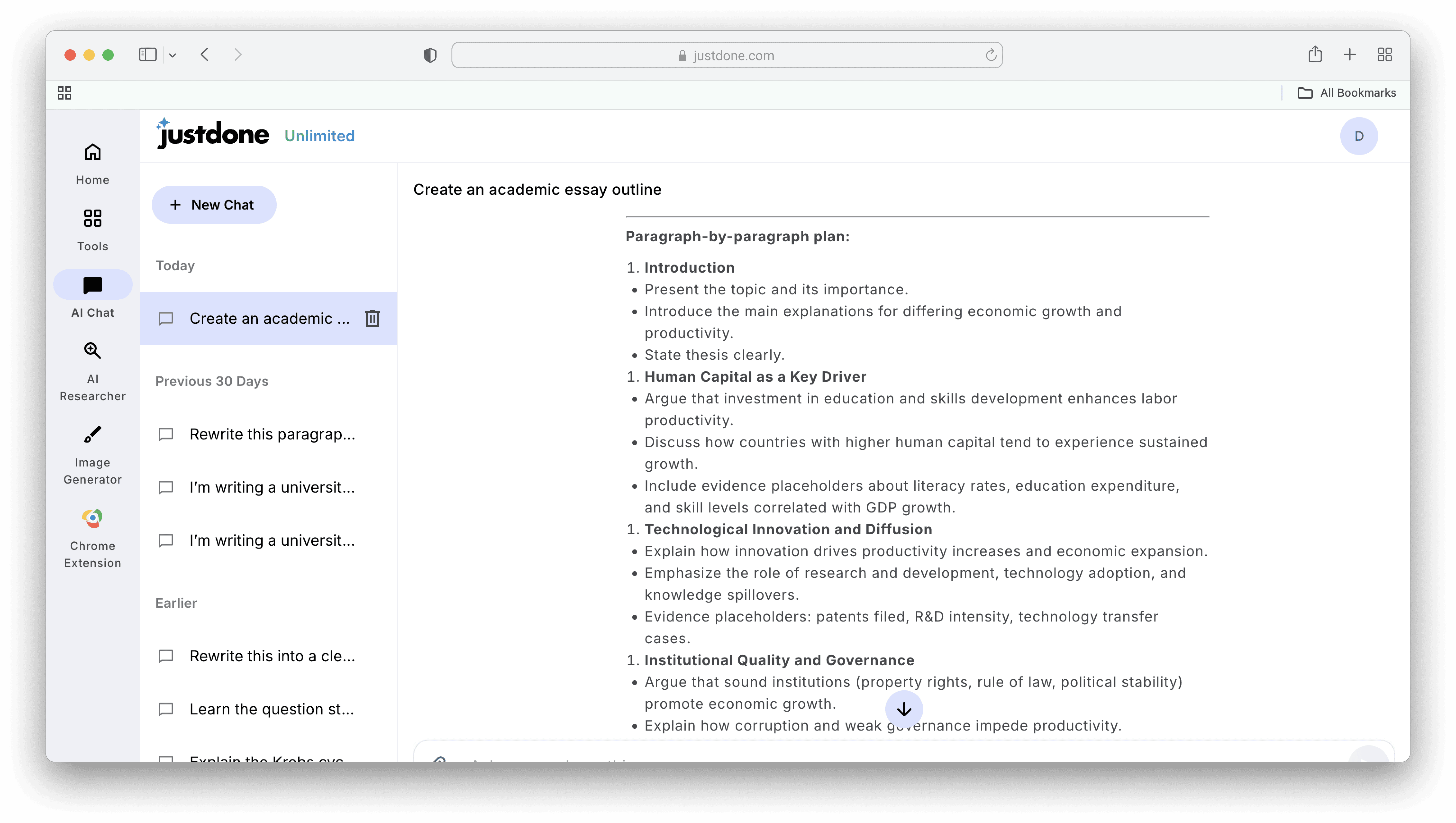 For instance, let's write an outline for a thesis in macroeconomics about Economic Growth and Productivity: What Explains Long-Term Differences Across Countries. I used JustDone AI chat and the prompt above.