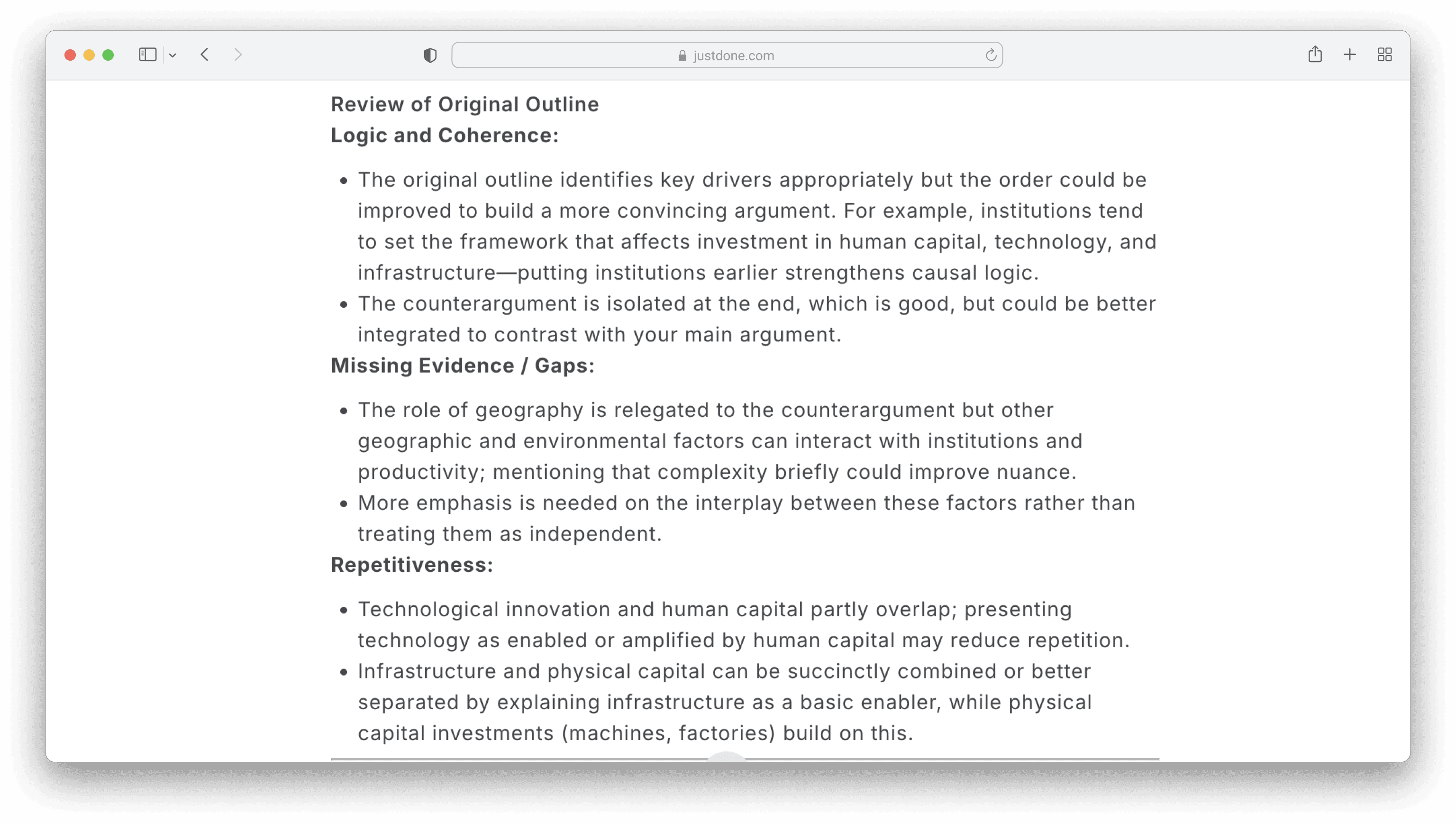 First, JustDone explains what gaps the outline actually has and what should be improved.