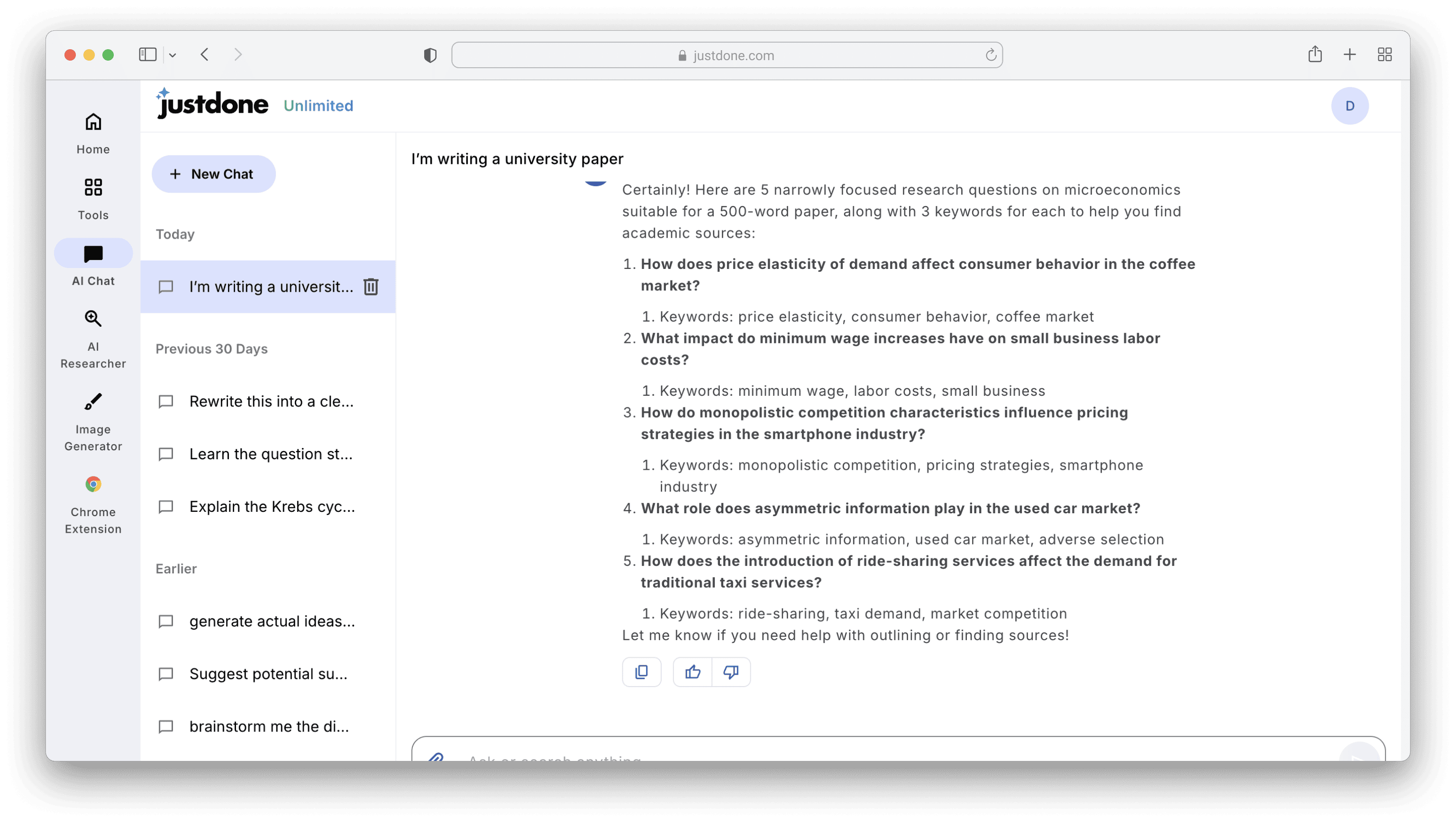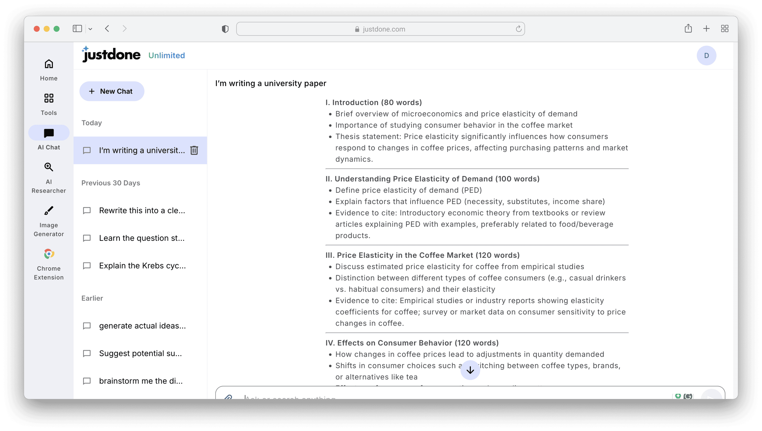 Include a counterargument section when appropriate.That’s how Outline for a Microeconomics research paper from the previous prompt may look with the help of JustDone AI chat.