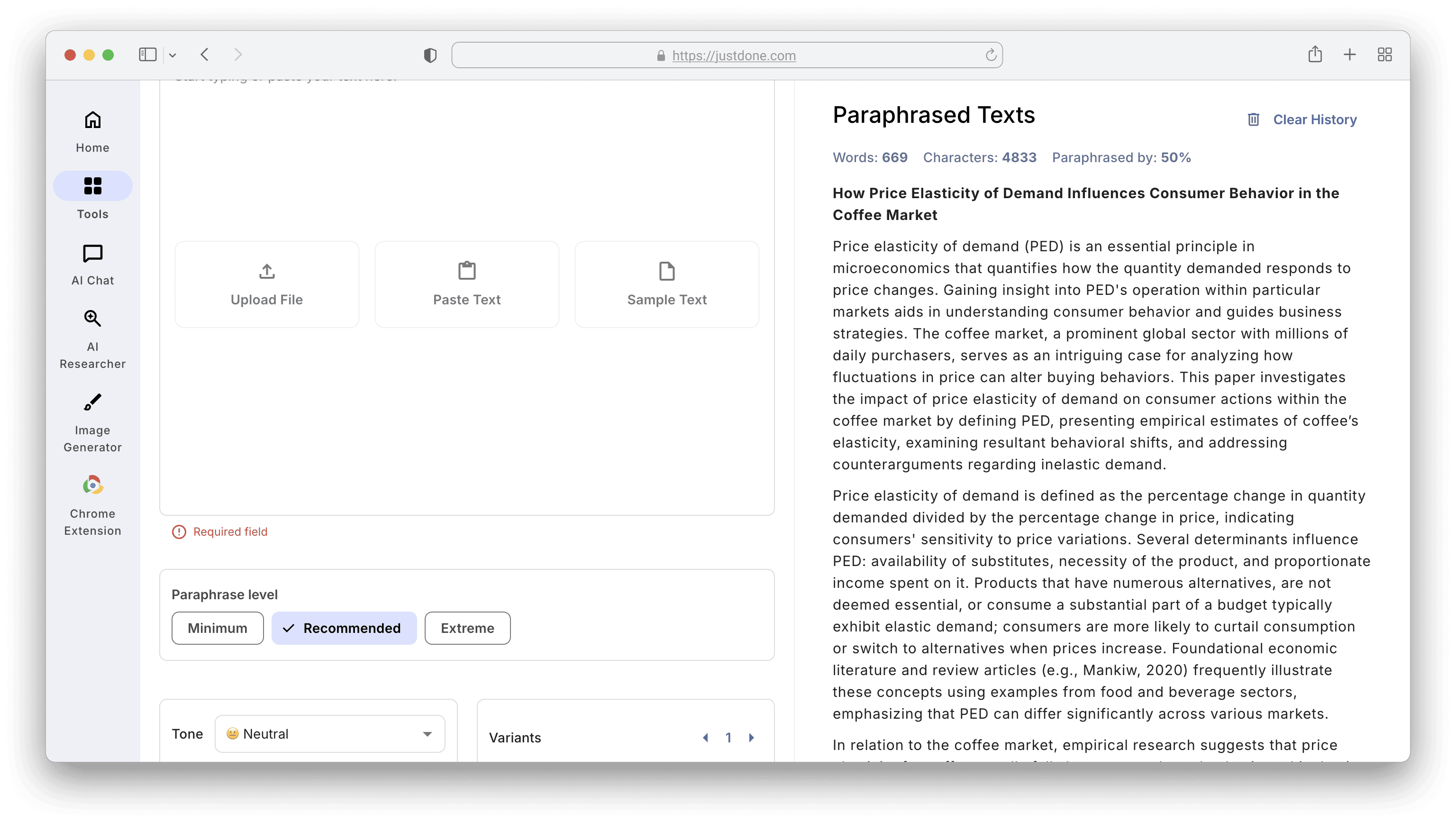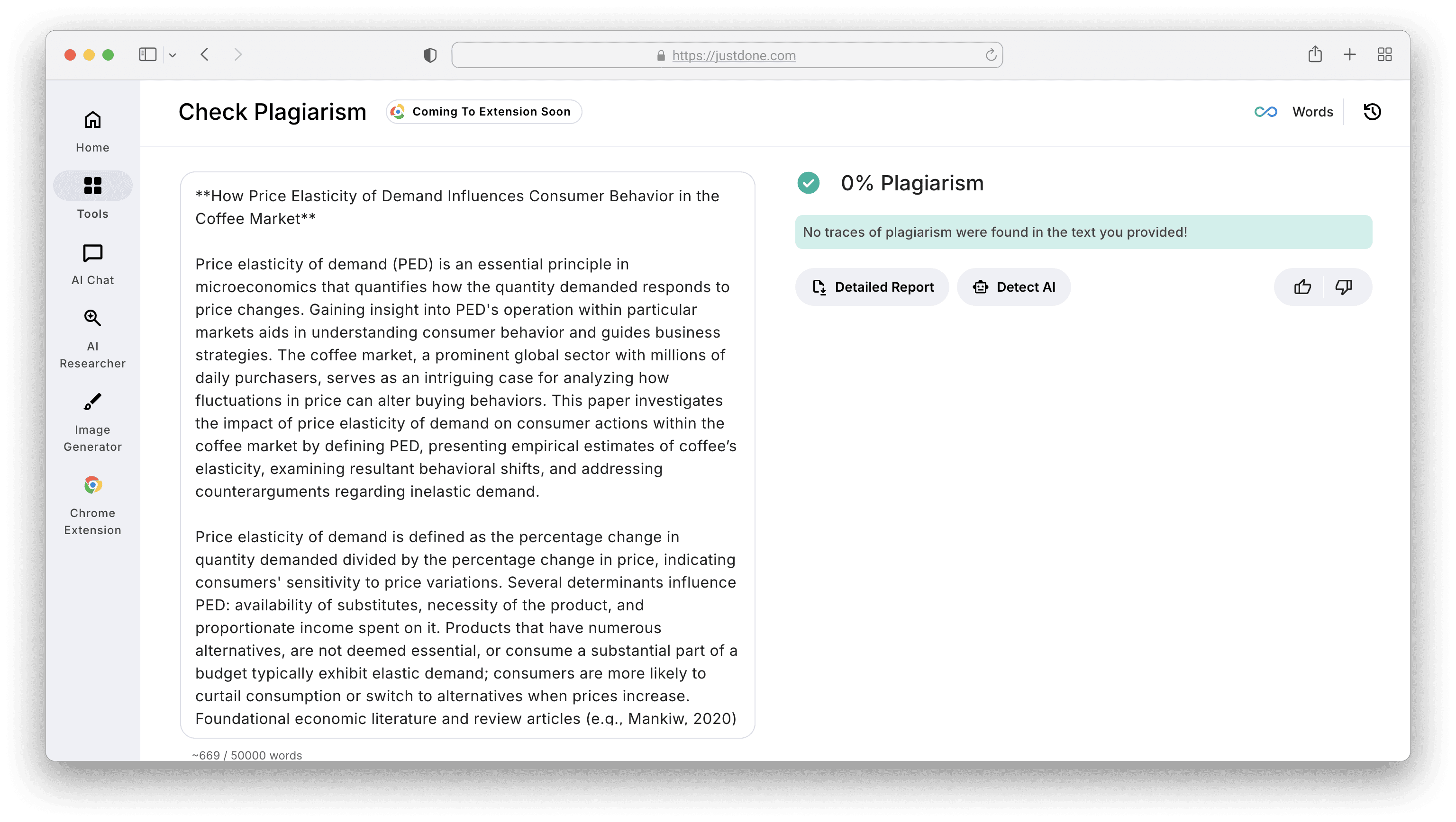 Also, if your text feels too robotic, you could be flagged as AI-generated. You can revise it with AI humanizer and reduce AI score. JustDone humanizing tool will make your text sound human and keep your meaning and evidence. Here’s how it works with the Microeconomics research paper.
