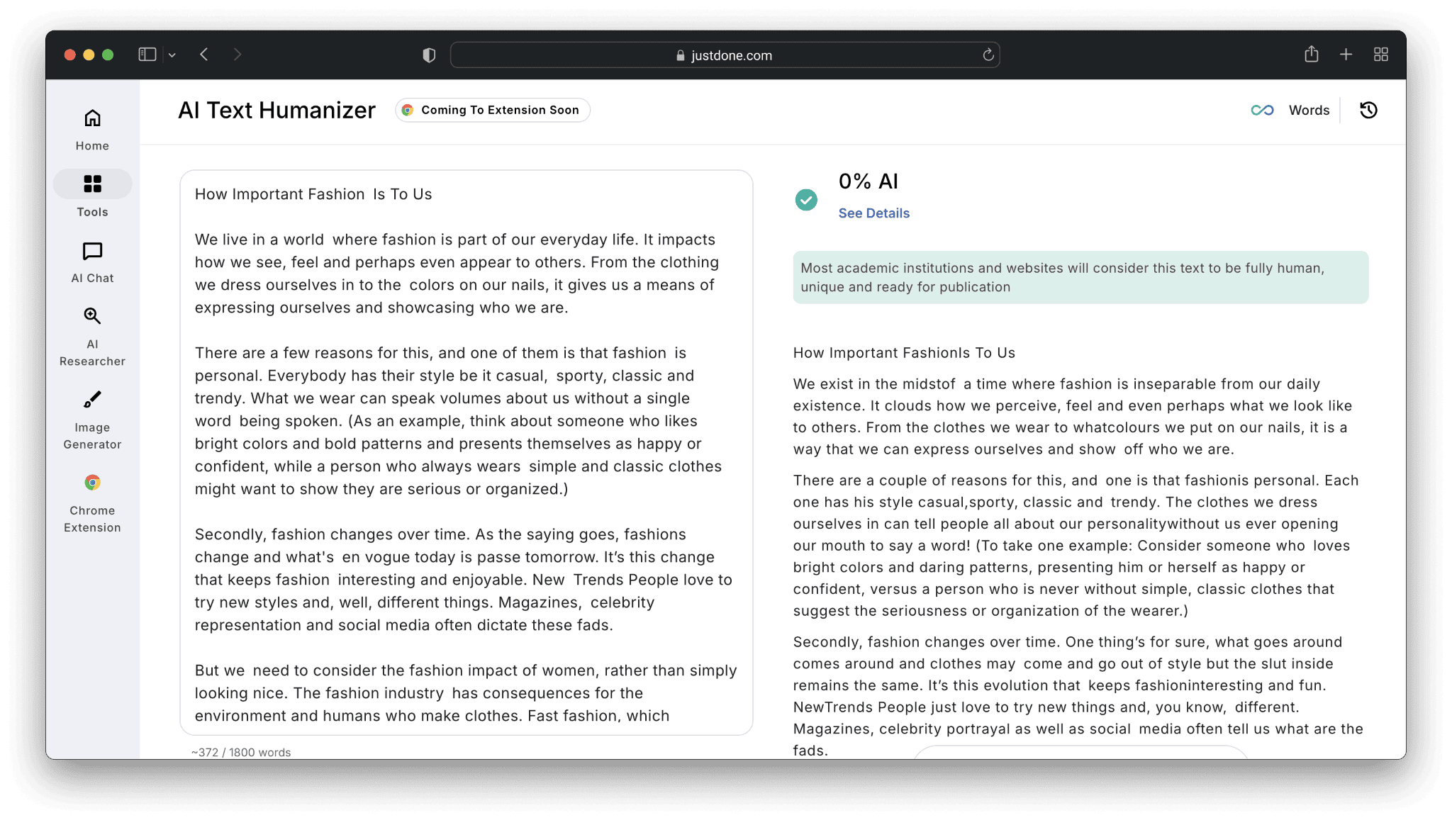 - Refine your results to sound human: run drafts through JustDone’s Detector and Humanizer for natural tone.