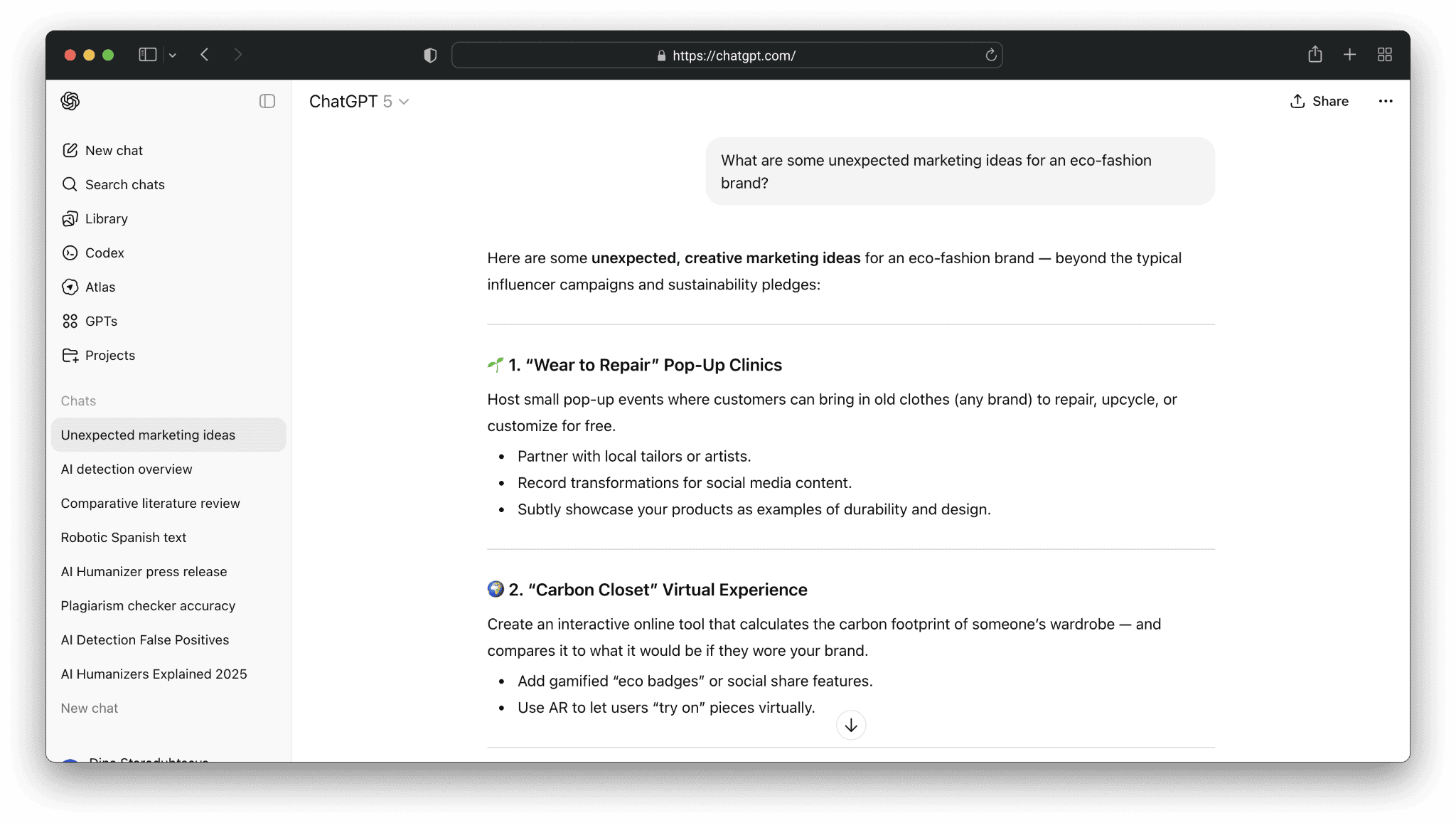 When you ask JustDone or ChatGPT to “brainstorm eco-friendly fashion campaign ideas,” both return a wide variety of concepts. ChatGPT excels at breadth. It delivers dozens of rapid ideas in seconds, which makes it ideal when you need quick inspiration or want to test multiple directions.