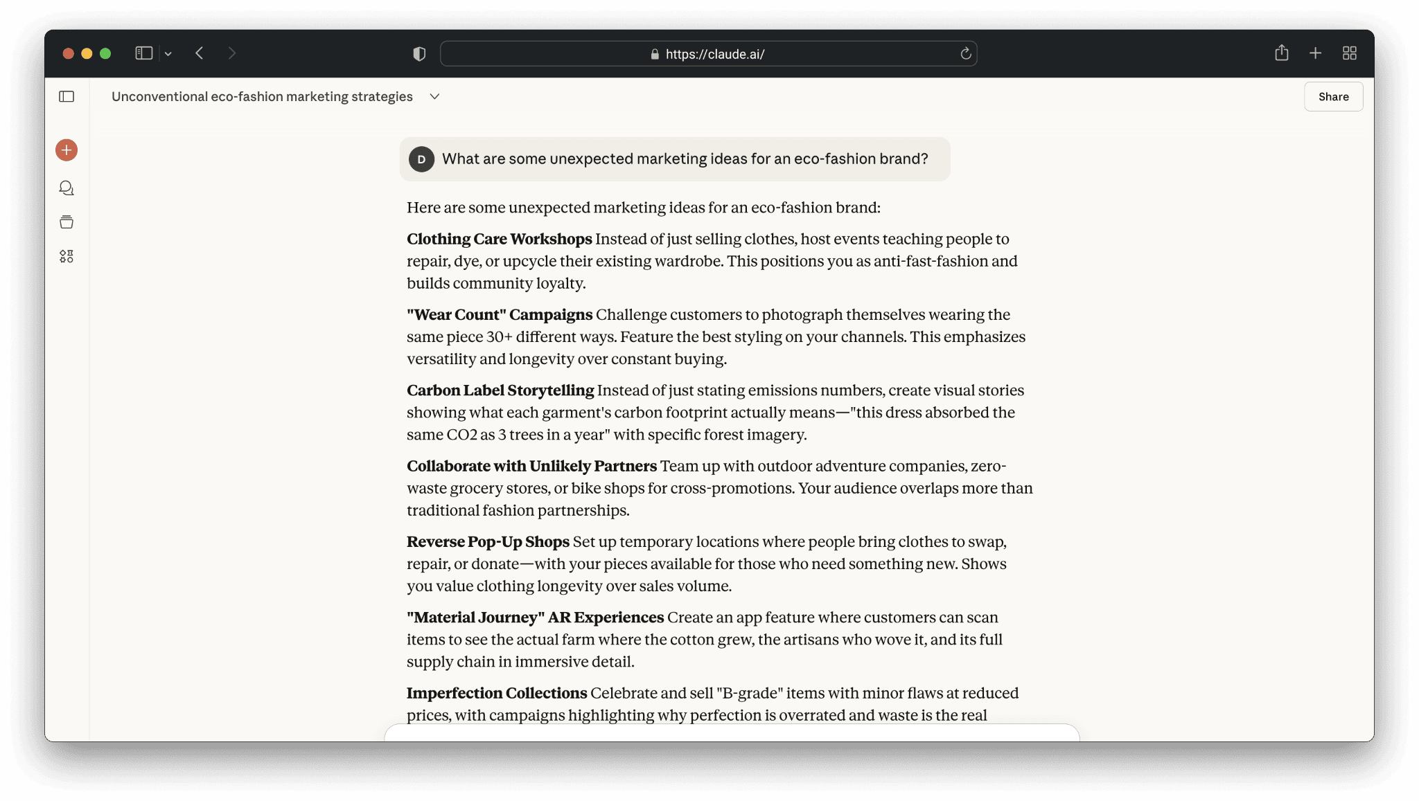 - “What are some unexpected marketing ideas for an eco-fashion brand?”