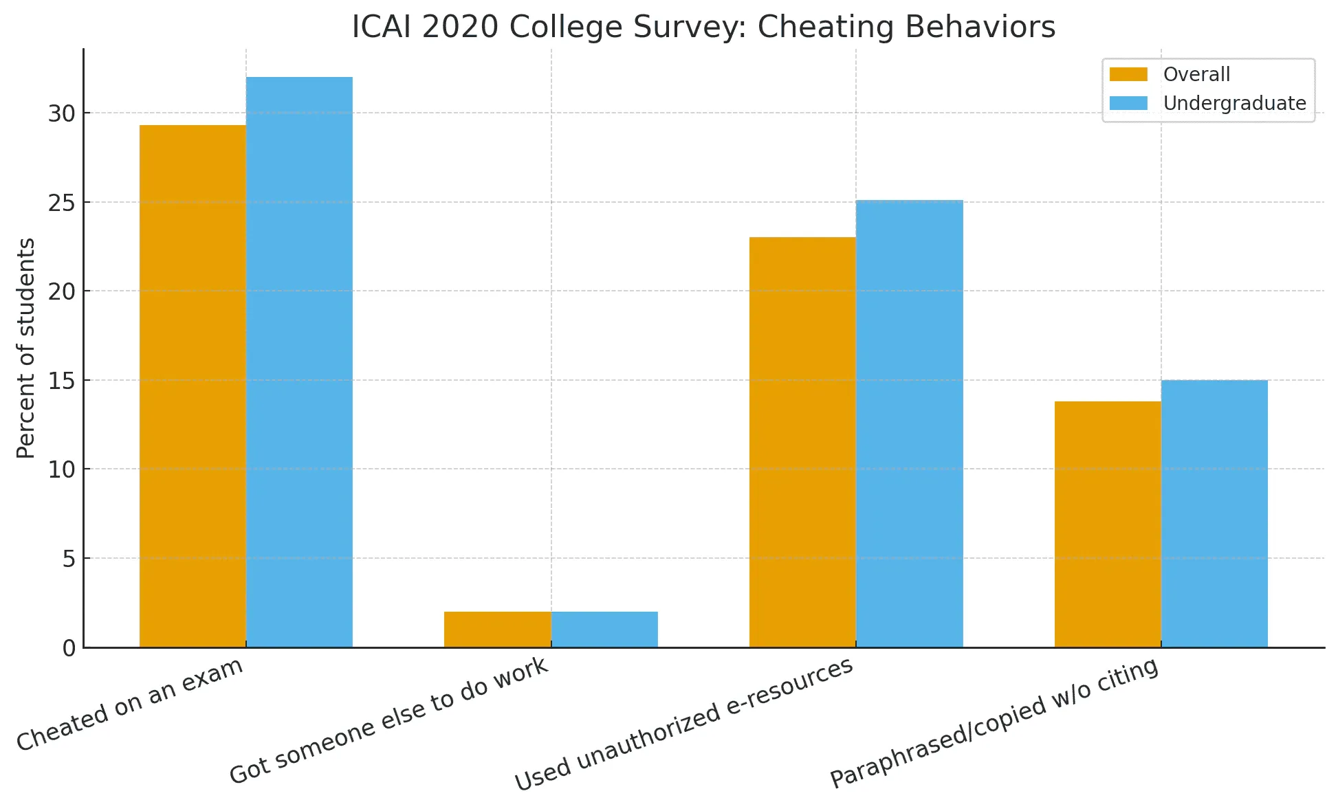 Long-running surveys from the International Center for Academic Integrity show over 60% of university students admit to some form of cheating. It shows how common academic integrity risks actually are.