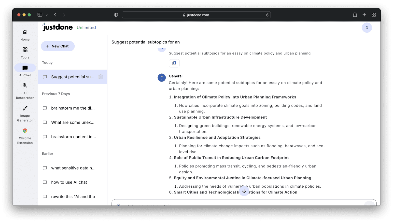 - “Suggest potential subtopics for an essay on climate policy and urban planning.”