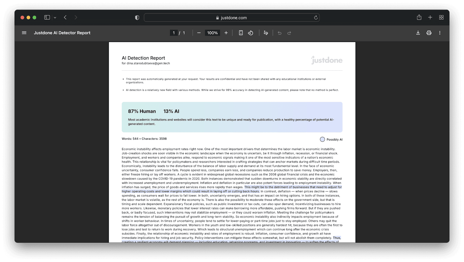 Before submission, AI tools can help you identify unclear sections, grammar issues, or unintentional repetition. Tools like JustDone’s AI Detector can also help you understand which parts of your text might resemble AI writing. Your goal is not to hide it, but to check that your essay still reflects your own voice and phrasing. Check the reports from the tools necessarily and work with the sections that are flagged, no matter who wrote them - you or AI.