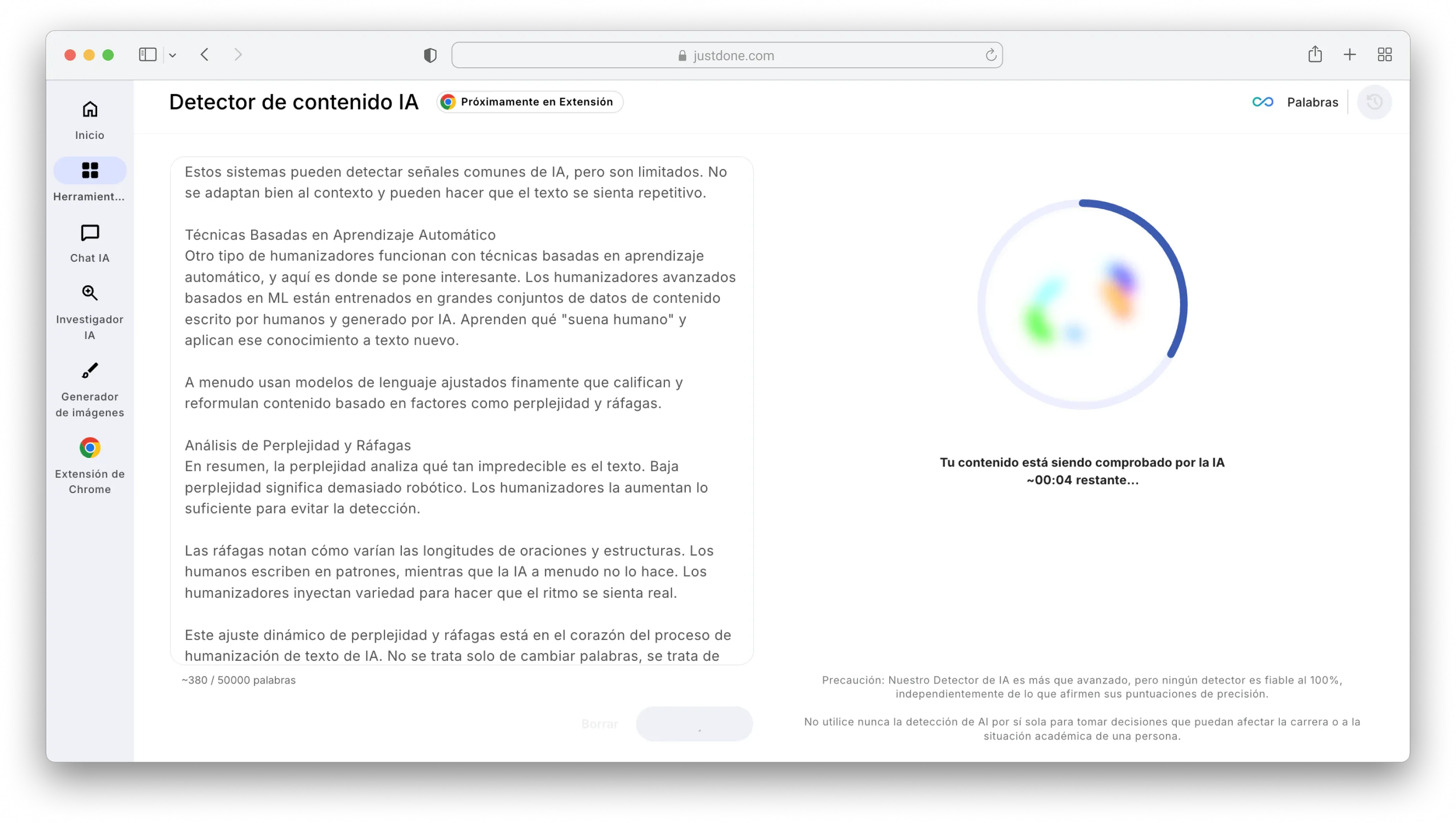 Antes de enviar tu texto, pruébalo en múltiples detectores. El Detector de IA de JustDone te muestra exactamente qué frases activan falsos positivos, para que puedas corregirlas de forma proactiva. Verifica tu texto ahora y obtén resultados en 30 segundos. Pruébalo gratis - sin compromisos, sin complicaciones.