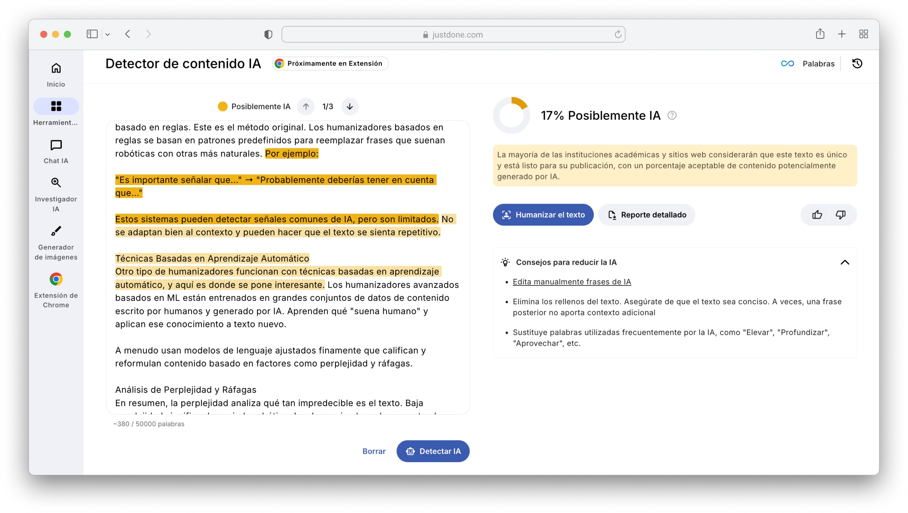 | JustDone AI Detector | Escritura profesional | Claridad, útil para tono académico | A veces sensible con textos muy formales | Alta |