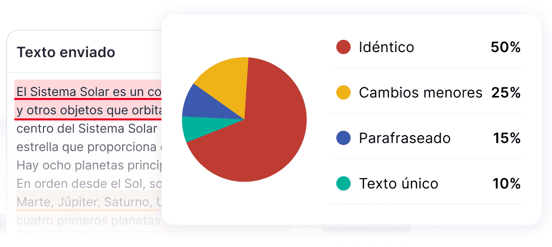 Nuestros informes detallados muestran qué partes de tu texto necesitan atención y por qué. Verás qué es idéntico, parafraseado o sólo ligeramente modificado y de dónde procede.
