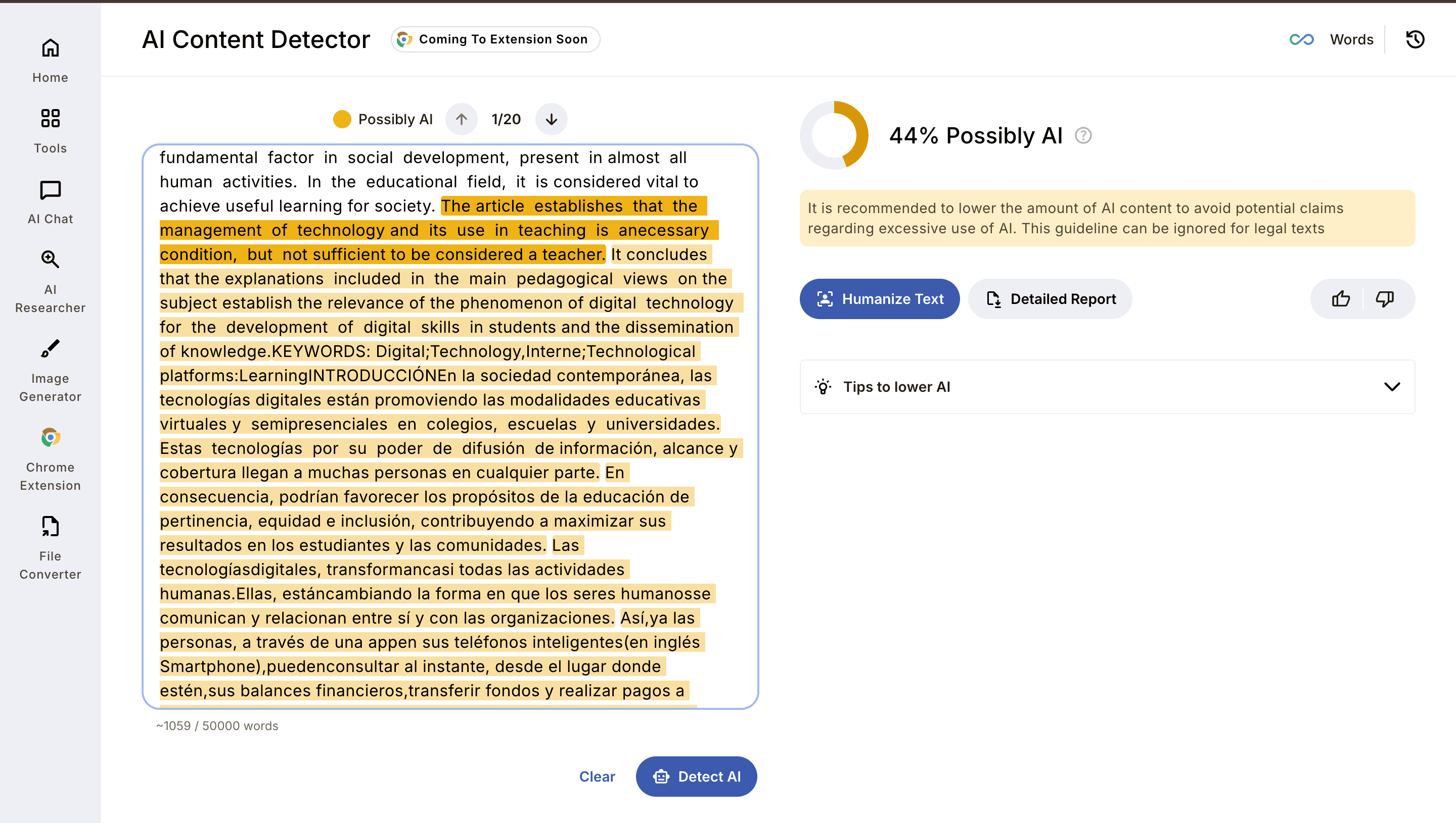 JustDone está diseñado para que la detección no sea el punto final, sino el punto de partida. Muestra cuáles oraciones específicas fueron marcadas, permite navegar entre ellas de forma numerada y ofrece un Humanizador de IA integrado para reescribir lo que fue detectado sin salir de la plataforma.