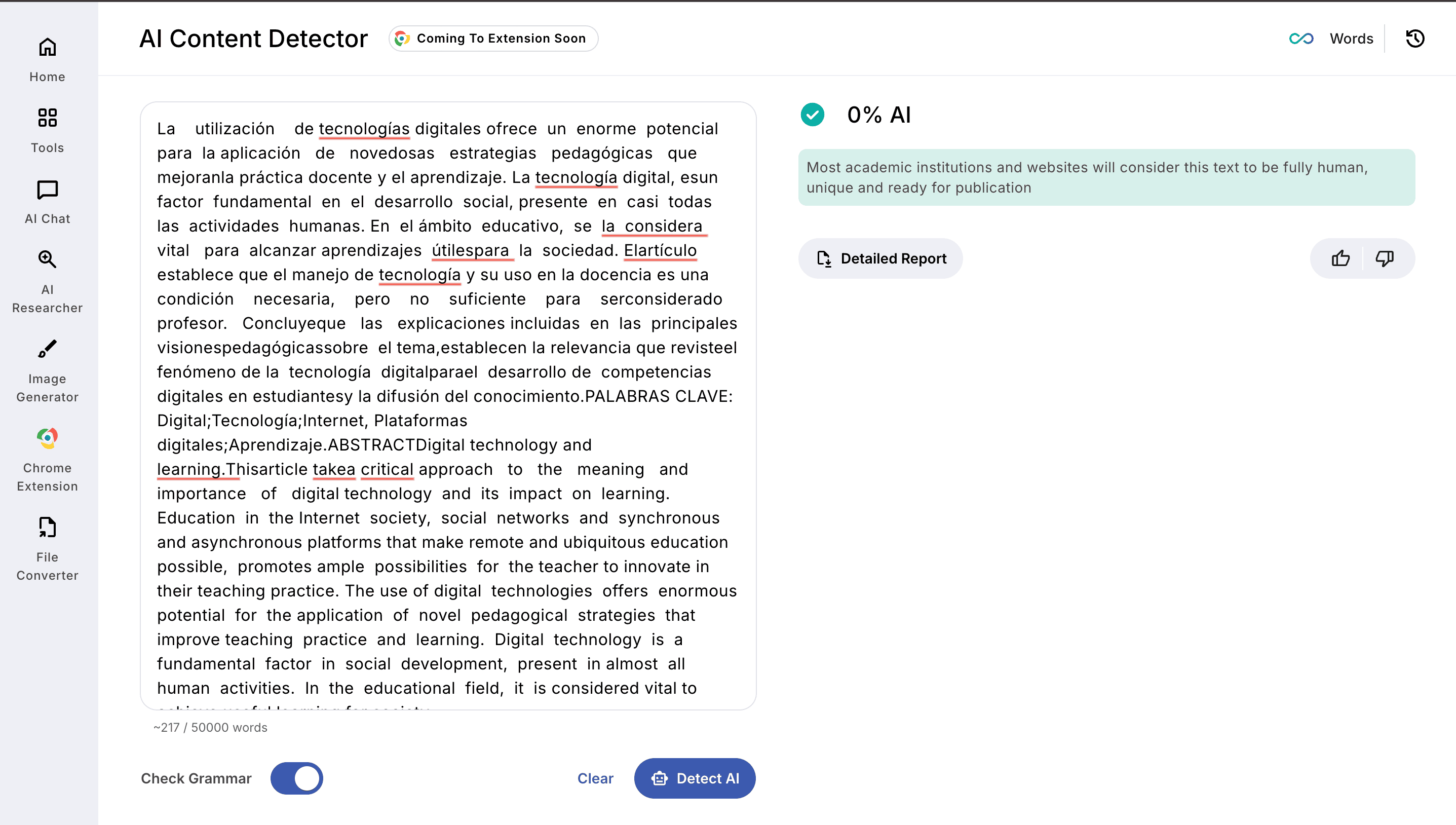 El plan gratuito permite analizar hasta 15.000 caracteres por escaneo. Devuelve un porcentaje de probabilidad de IA y resalta los fragmentos que considera generados por máquina. Con el tiempo, ZeroGPT sumó herramientas adicionales: verificador de plagio, parafraseador, resumidor, corrector gramatical y detector de imágenes IA. Aun así, la detección de IA sigue siendo su función principal.