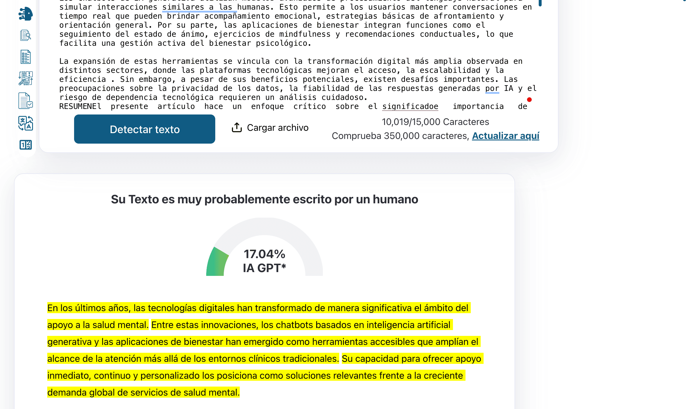 Prueba 1: Texto académico en inglés escrito por humanos. Tomamos un fragmento de una publicación académica sobre inteligencia artificial y salud mental, totalmente escrita por personas, con tono formal y estructura técnica. Este tipo de texto es exactamente el que más activa falsos positivos en muchos detectores, por su precisión y consistencia de tono.