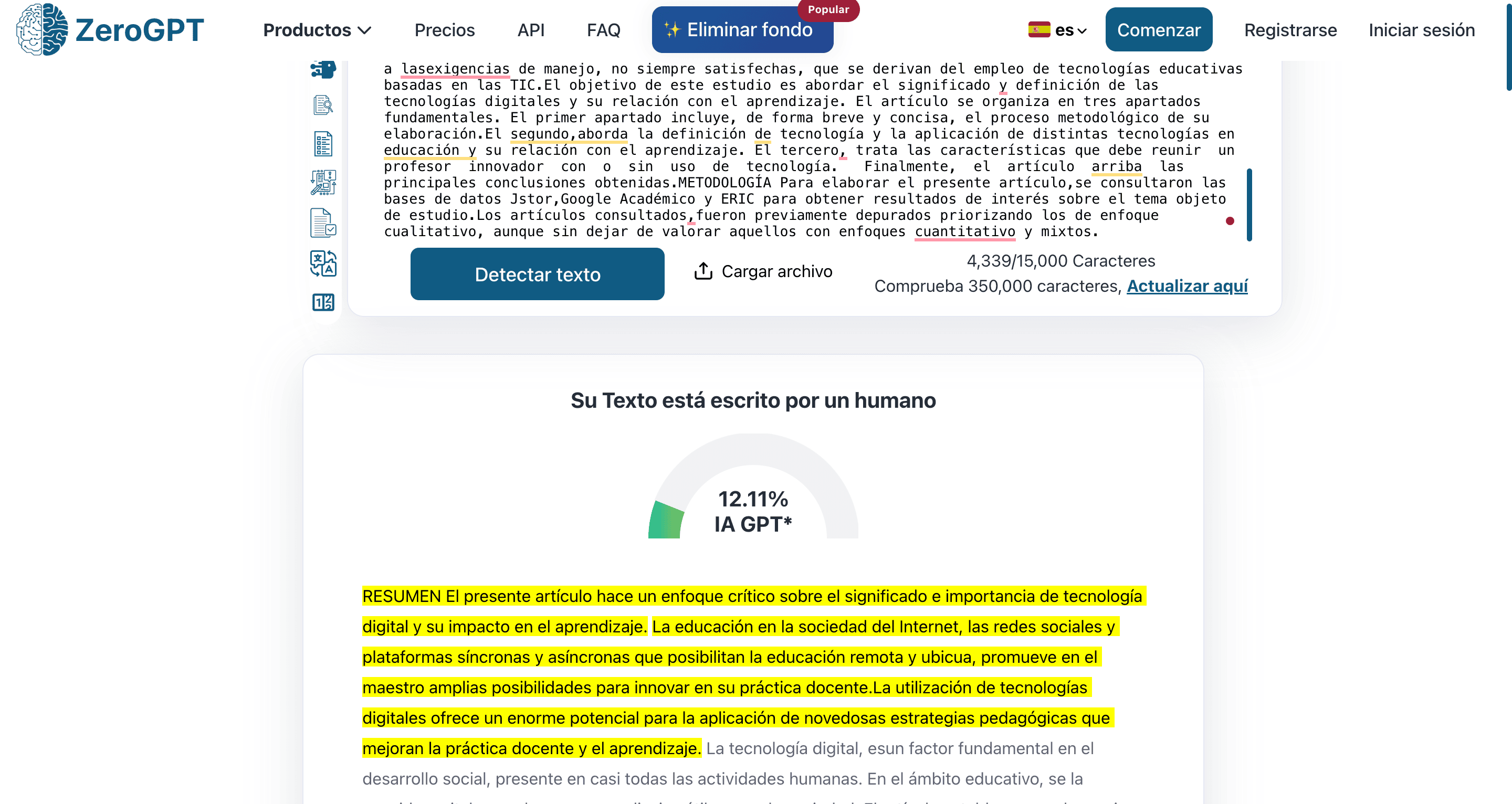 Además, ZeroGPT entrega un porcentaje pero no explica qué oraciones generaron ese puntaje ni por qué. No hay navegación entre fragmentos marcados, no hay herramienta para corregir lo detectado, y los resultados no se guardan en el plan básico, lo que dificulta comparar versiones o compartir evidencia.