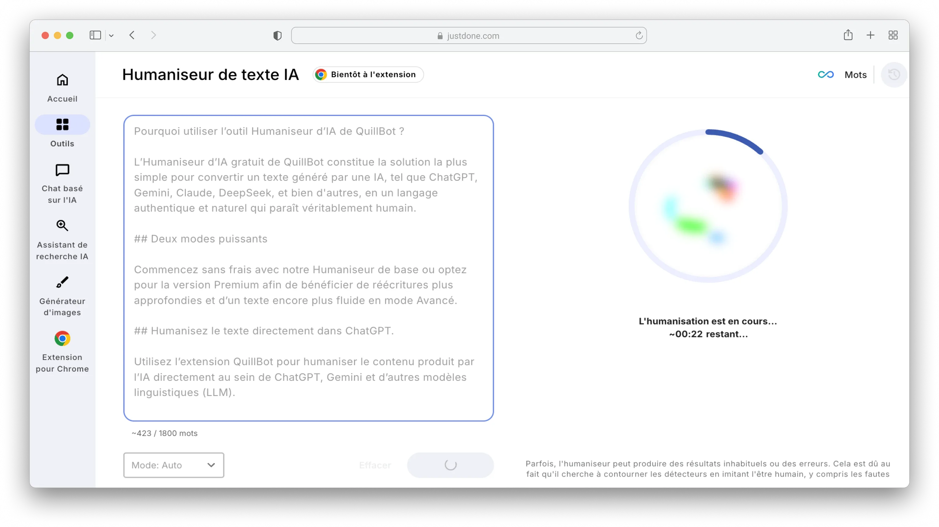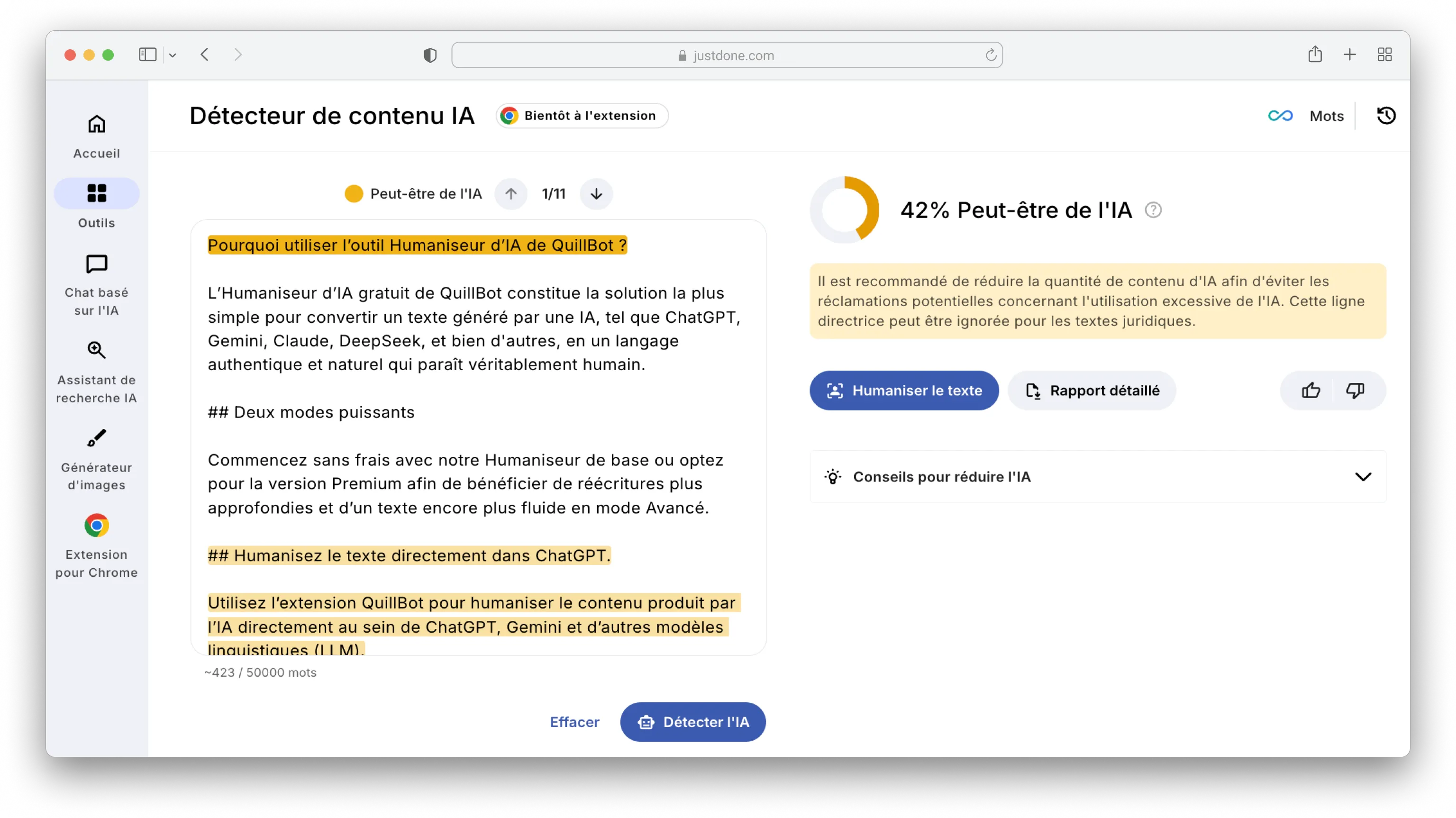 Voici comment je procède habituellement : après avoir rédigé mon premier brouillon, je le passe dans le Détecteur d'IA par JustDone pour voir quelles sections pourraient être signalées. Si je trouve des zones problématiques — des passages trop proches du matériel source ou qui sonnent trop « IA » — je copie uniquement ces sections dans l'Humaniseur d'IA de JustDone. L'outil les réécrit avec une structure variée et un nouveau langage, tout en préservant mes idées.