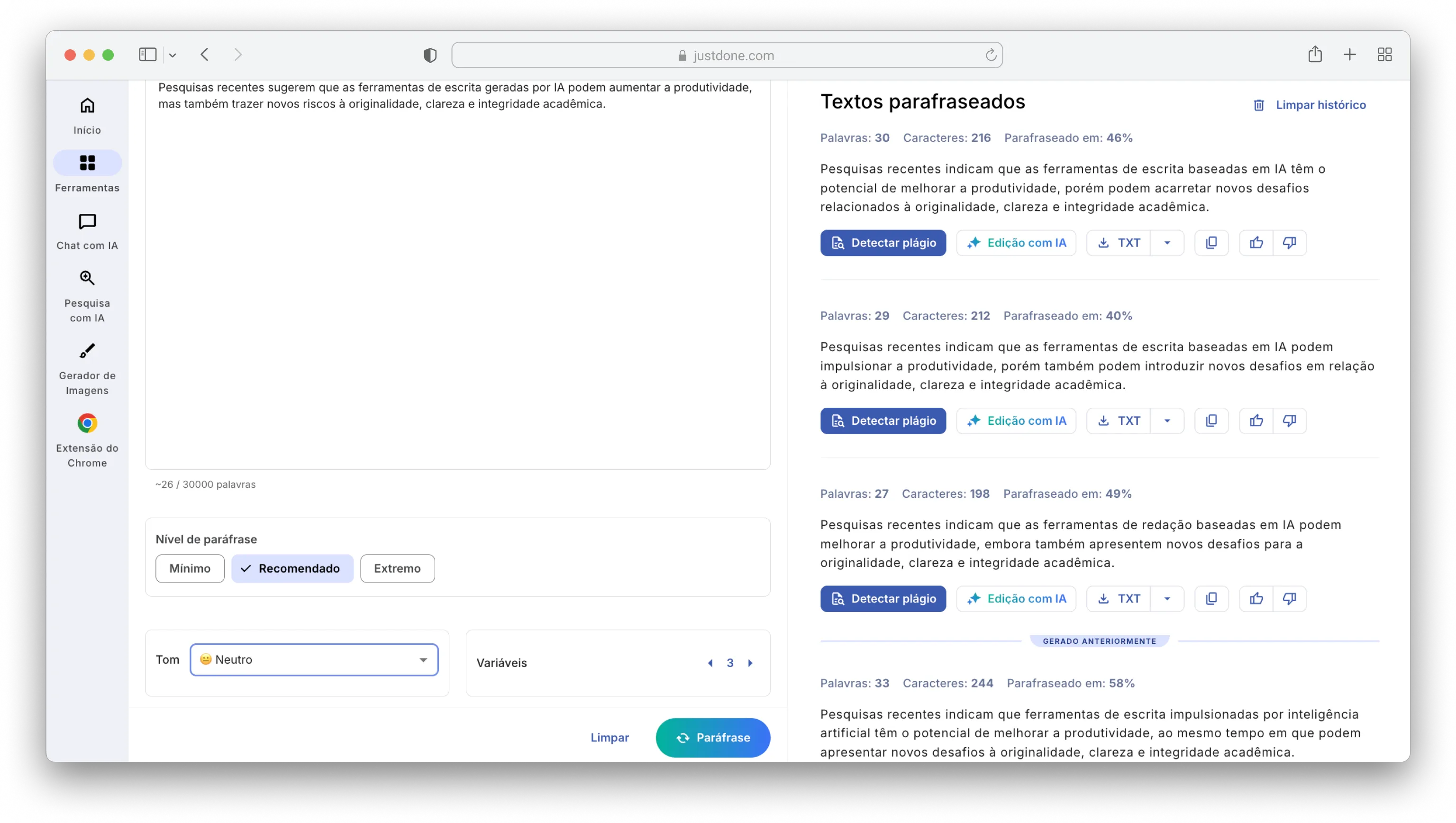 Para trabalhos acadêmicos, sempre combino a paráfrase com verificações de plágio e IA. O JustDone facilita isso em um único espaço de trabalho.