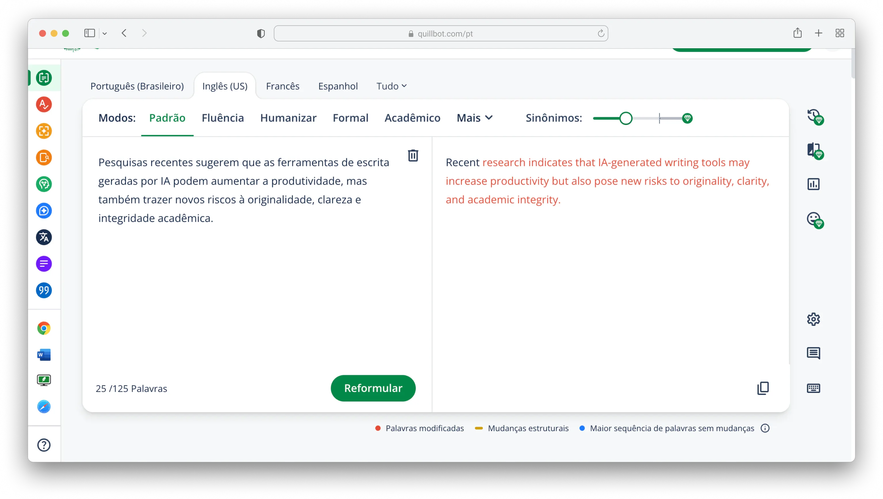• O plano gratuito tem limite de palavras (cerca de 125 palavras por paráfrase) e apenas 2 modos.