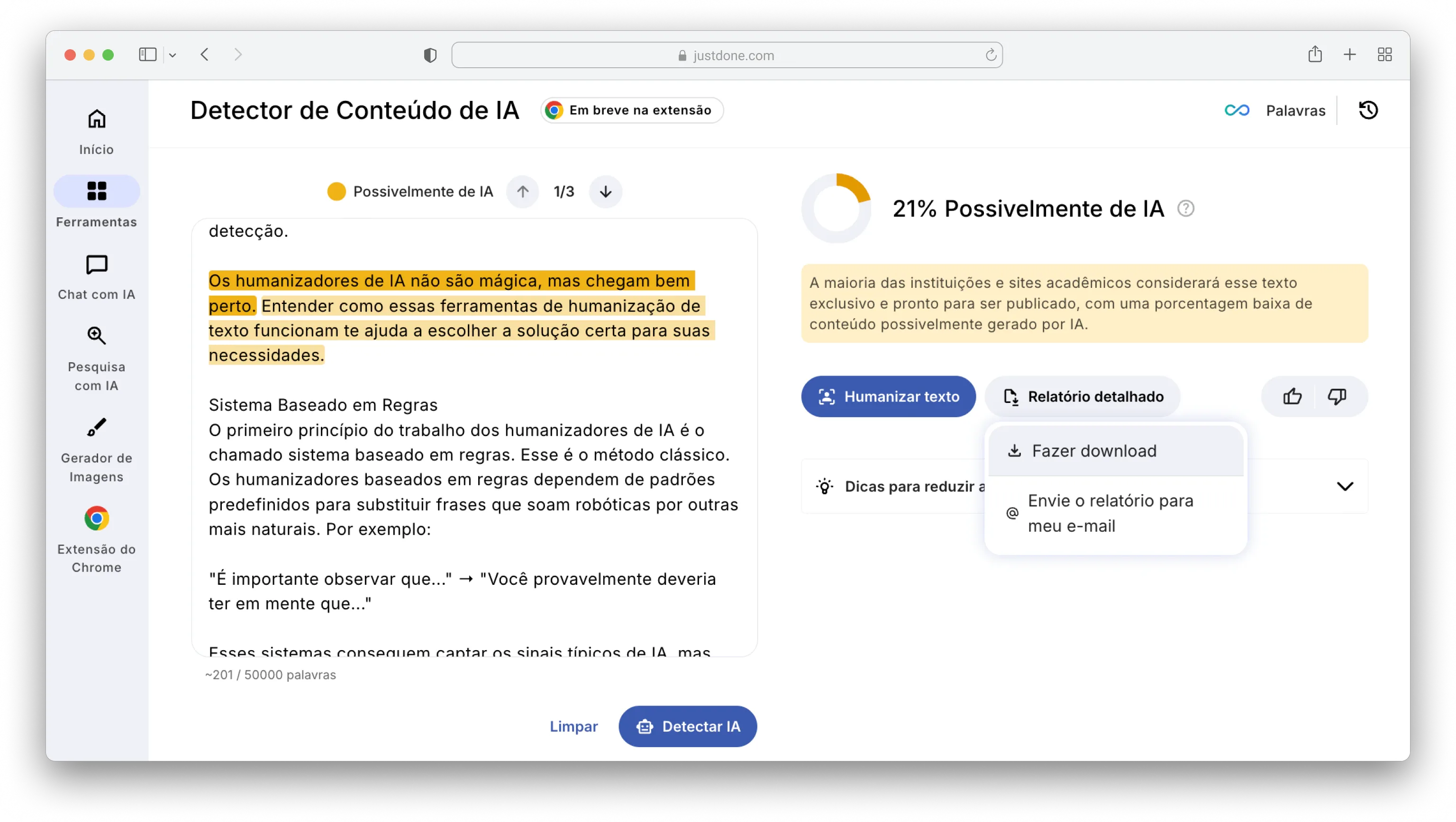Os relatórios do Turnitin são densos e frequentemente técnicos. Os relatórios do JustDone são legíveis e fáceis de aplicar. Você pode compartilhá-los com editores ou anexá-los aos seus próprios relatórios como prova de autoria. Você vê claramente quais frases têm maior probabilidade de ser IA, e quais não.