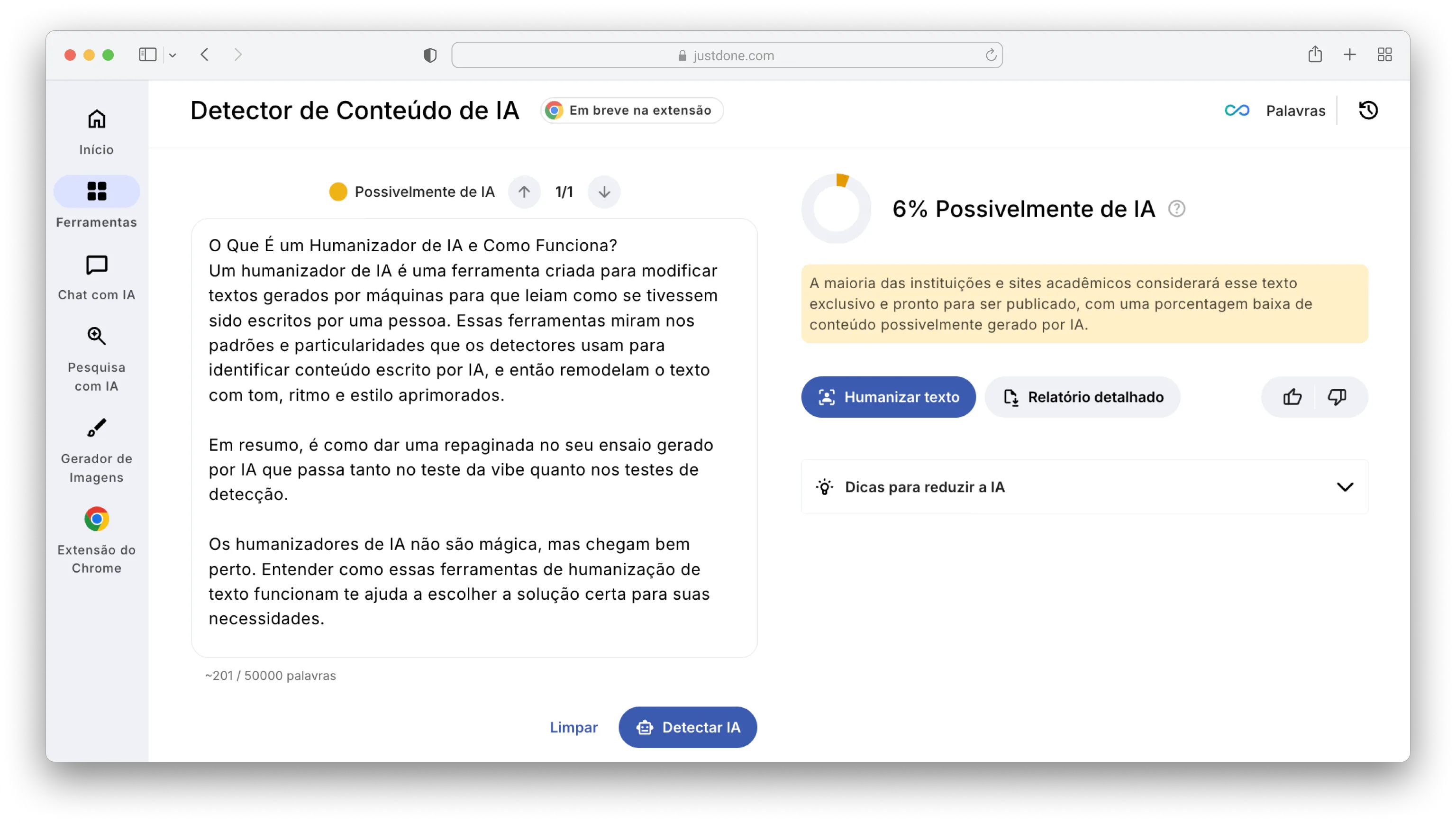 - Combine detectores para maior verificação: use o JustDone junto com ferramentas como Copyleaks, GPTZero ou Originality.ai para confirmar resultados.